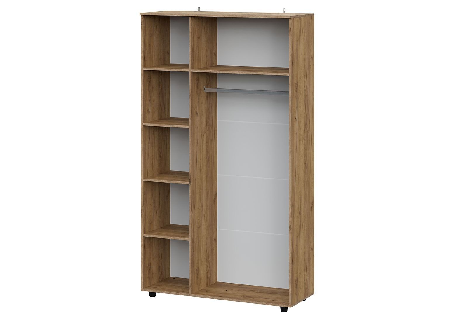 Внутри шкафа расположены полки и отсек со штангой для вешалок. Это позволяет удобно разместить одежду и аксессуары. Шкаф комплектуется креплениями к стене для дополнительной устойчивости.
