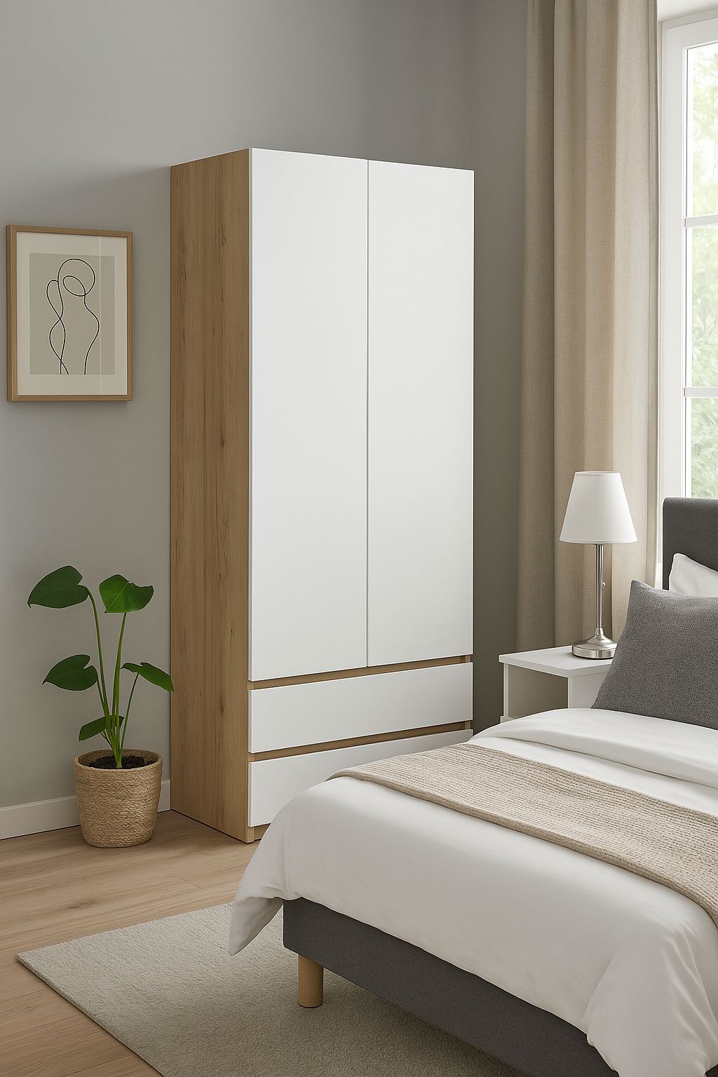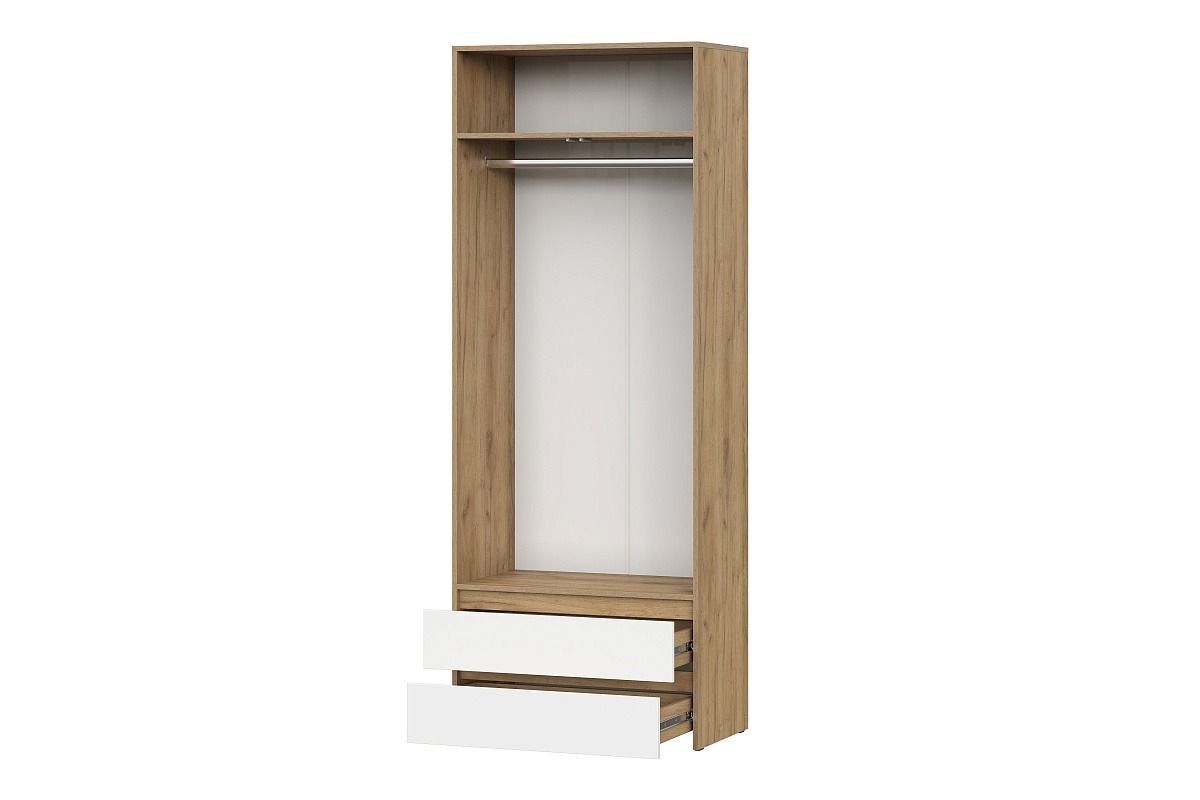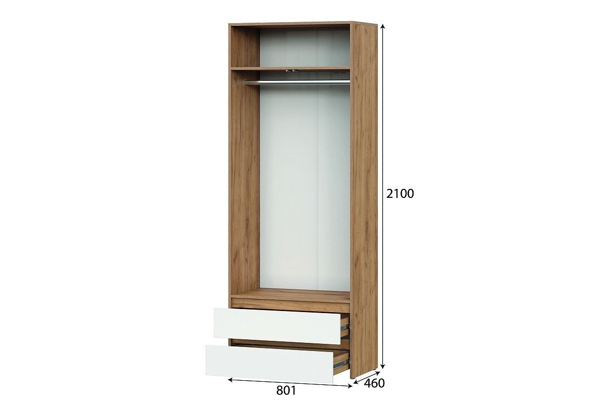Особенностью шкафа является его конструкция: он имеет распашные двери, которые могут открываться в стороны, влево или вправо, что обеспечивает удобный доступ к содержимому. Шкаф оснащен одной полкой и штангой для вешалок, а также двумя ящиками для хранения мелких предметов одежды.