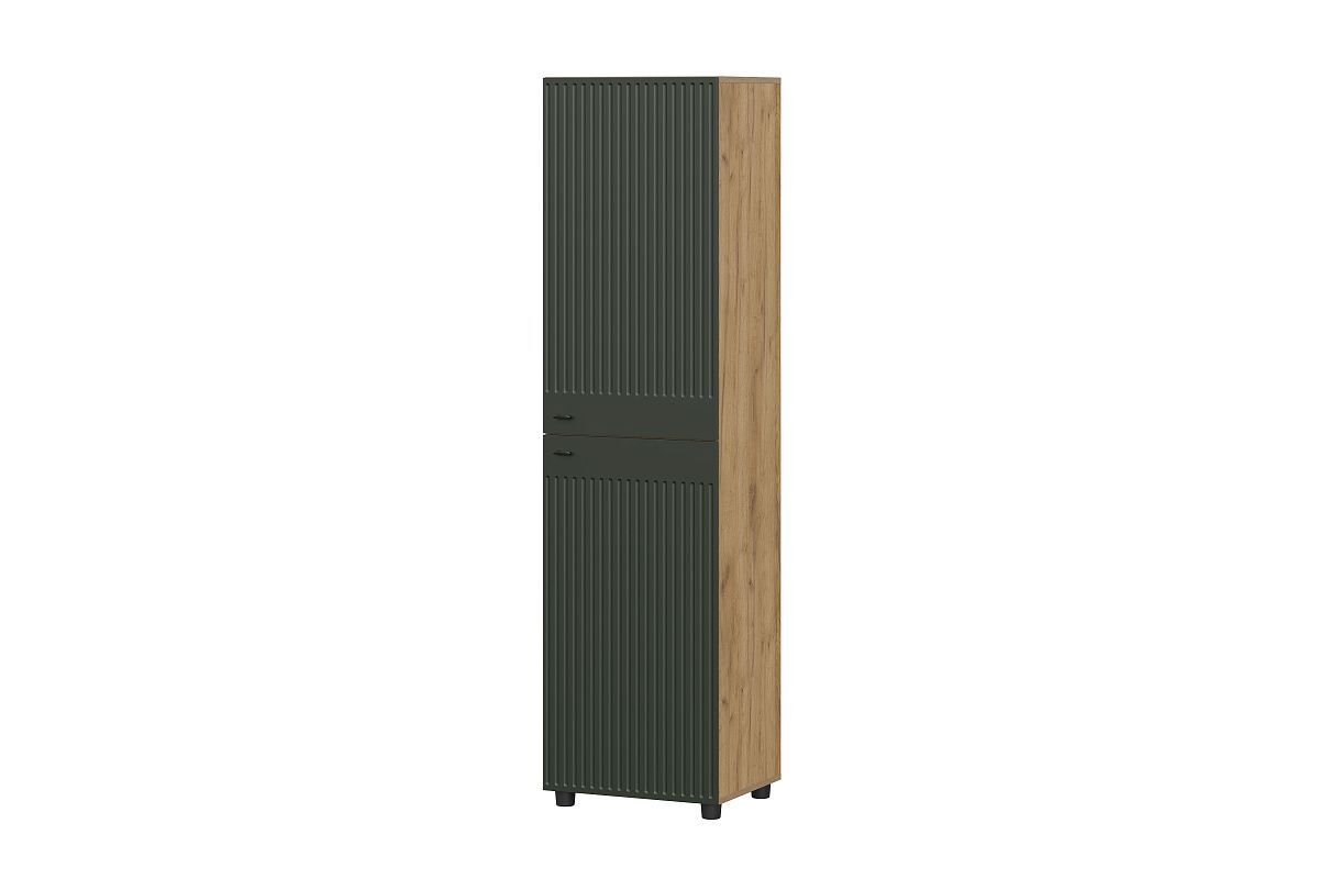 Шкаф-пенал выполнен в стильном сочетании зеленого и бежевого цветов, что позволяет ему гармонично вписаться в любой интерьер. Производитель использует название цвета "Дуб Золотой/Олива Софт", которое подчеркивает изысканность и элегантность дизайна.