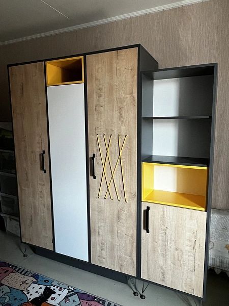 Шкаф 1 дв. для платья и белья штанга: ш=452 в=2213 г=578 мм Каркас: ЛДСП (16 мм) «Белое сияние» Декоративная опора: п/м лиственный (береза) Фасад: МДФ (16 мм), пленка ПВХ «Белый снег софт»