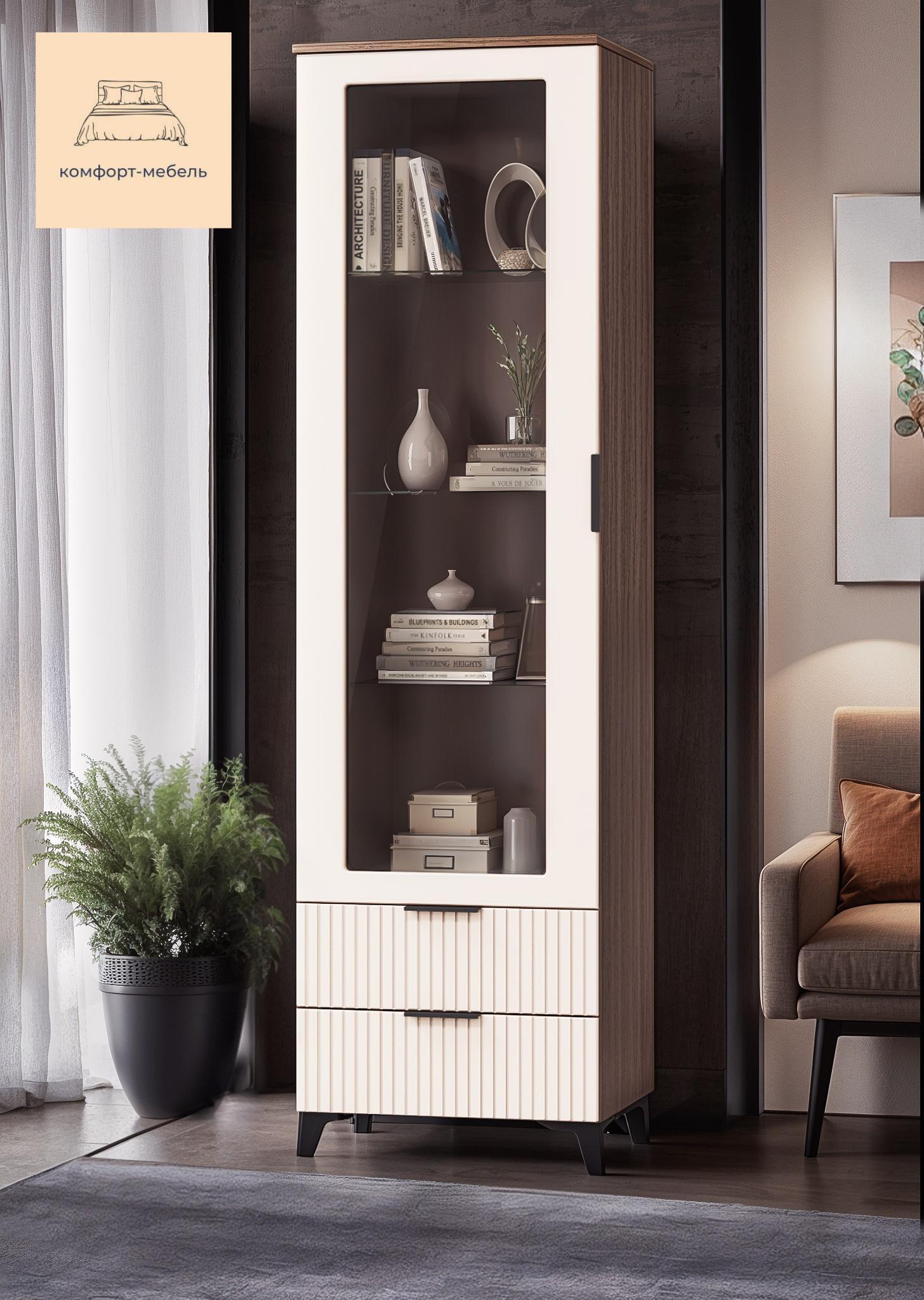 Шкаф-витрина стеклянный Бисквит/Дуб табачный, Тоскана - это современное и функциональное решение для хранения и демонстрации ваших любимых предметов.