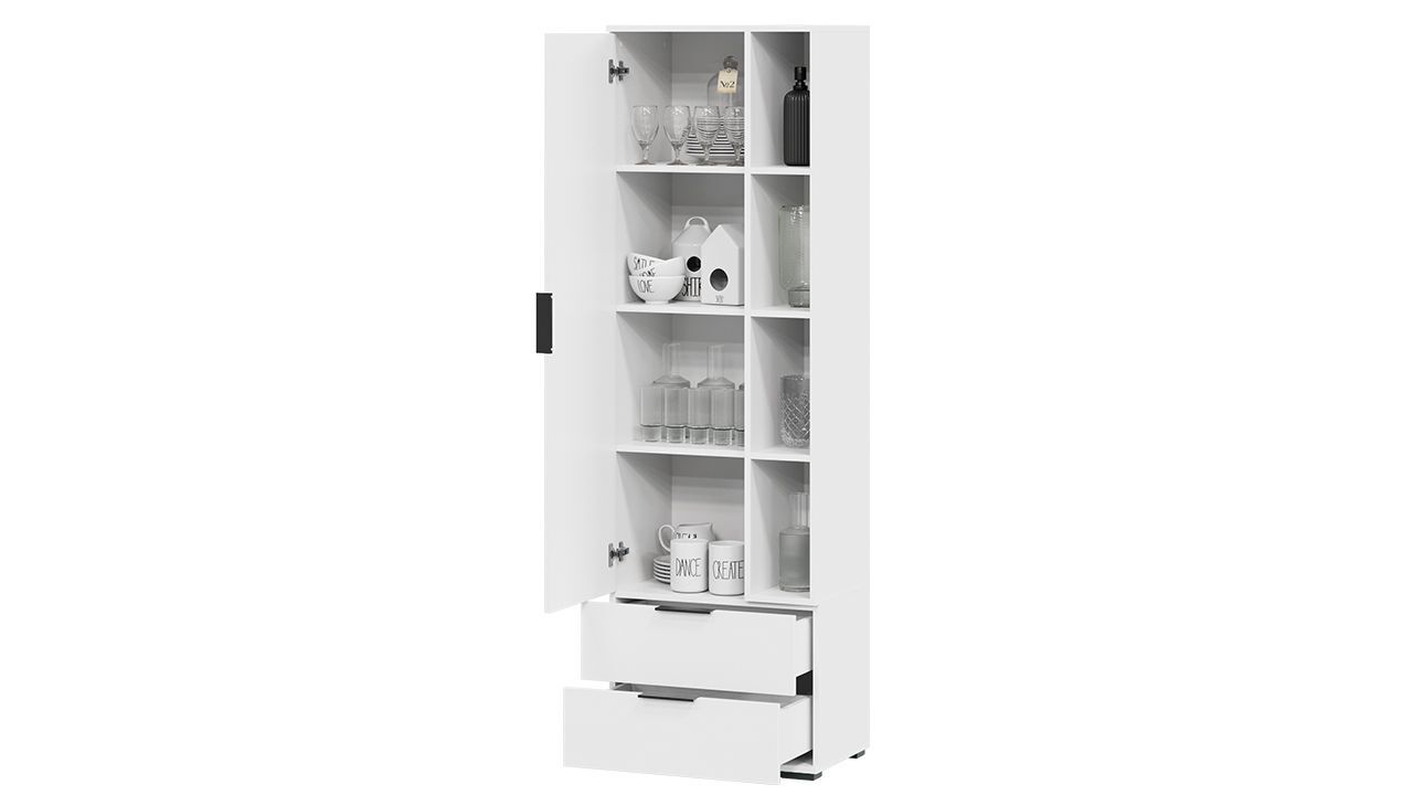 Шкаф-витрина оснащена одной открывающейся в стороны дверью и шестью полками. Это позволяет удобно разместить различные предметы и обеспечивает быстрый доступ к ним.