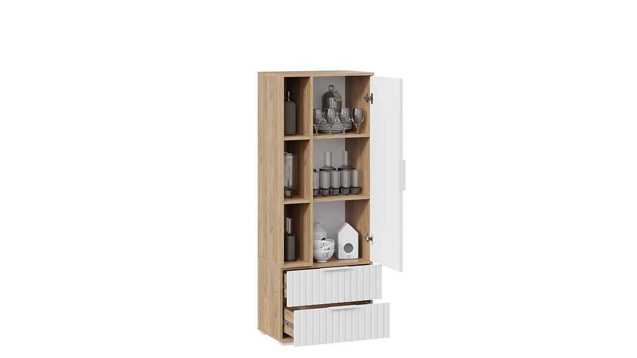 Шкаф-витрина оборудован одной открывающейся в стороны дверью и имеет шесть полок для хранения различных предметов. В комплекте также идут ящики для удобства хранения мелких предметов.