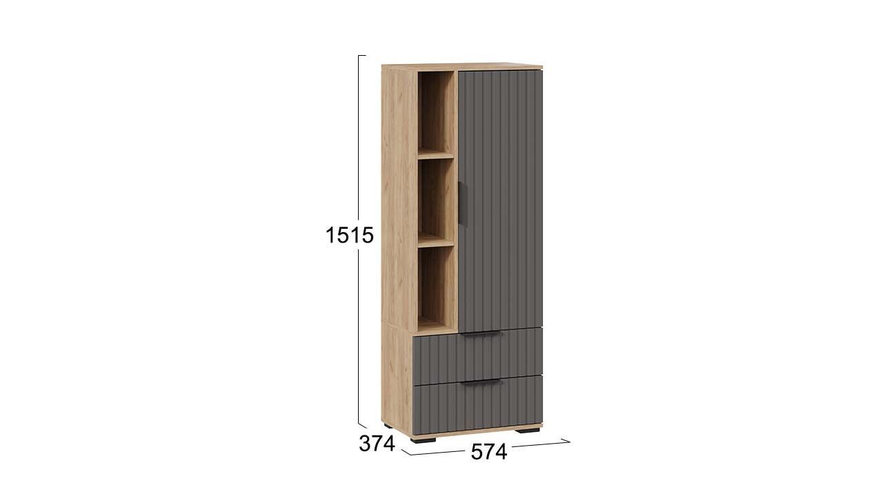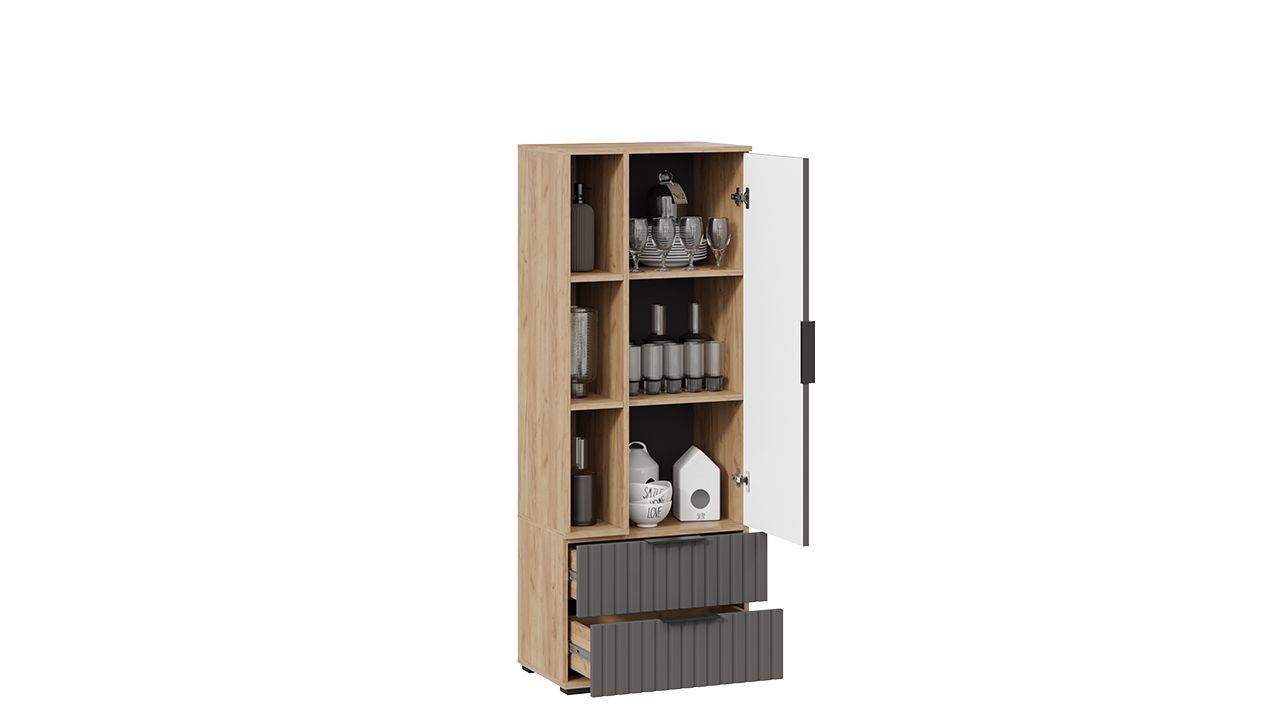 Шкаф-витрина в гостиную выполнен в современном стиле, сочетая в себе дуб крафт золотой и графит матовый цвета. Материалы каркаса и фасада – ЛДСП и МДФ, соответственно, а кромки каркаса обработаны ПВХ. Металлические ручки добавляют изделию элегантности и прочности.