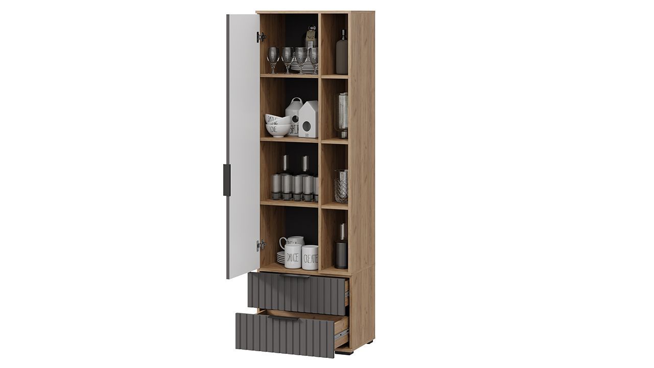 Шкаф-витрина в гостиную выполнен в современном стиле, сочетающем в себе дуб крафт золотой и графит матовый цвета. Материалы корпуса и фасада – ЛДСП и МДФ, покрытые пленкой ПВХ, что обеспечивает долговечность и устойчивость к повреждениям.