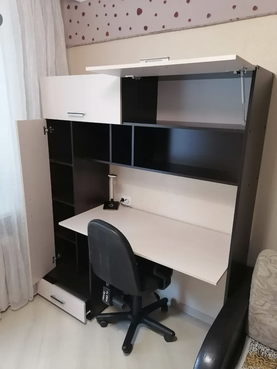 Стол оборудован двумя ящиками с роликовыми направляющими, что обеспечивает плавное и бесшумное открывание. Газлифты в антресолях с открыванием вверх позволяют удобно хранить мелкие предметы.