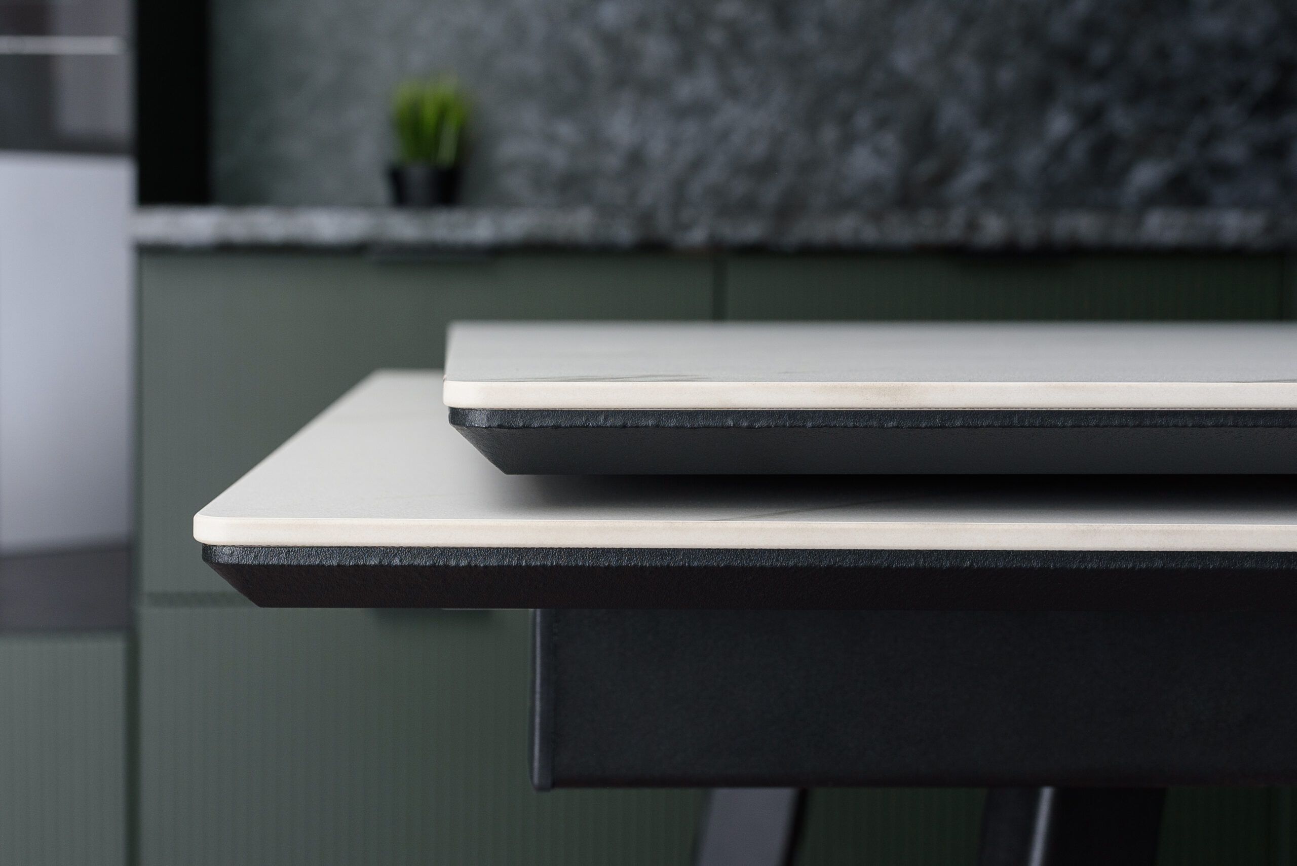 Столешница стола выполнена из керамогранита, который обладает рядом преимуществ. Этот материал не только прочен и долговечен, но и влагостоек, что делает его отличным выбором для использования на кухне или в столовой.