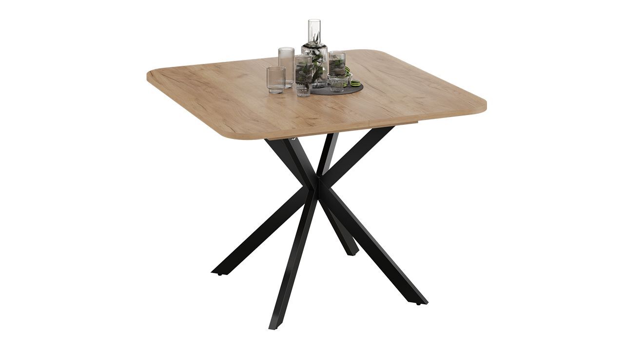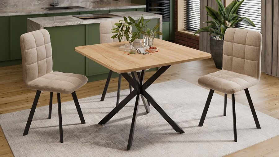 Стильный дизайн. Квадратный обеденный стол на перекрещенных ножках смотрится стильно, лаконично и ненавязчиво в любом интерьере. Столешница выполнена из ЛДСП 22 мм. Яркая особенность — оригинальная форма столешницы и опоры из металла, которые смотрятся привлекательно и современно. Ножки окрашены порошковой краской в цвета «Белый муар» и «Черный муар».