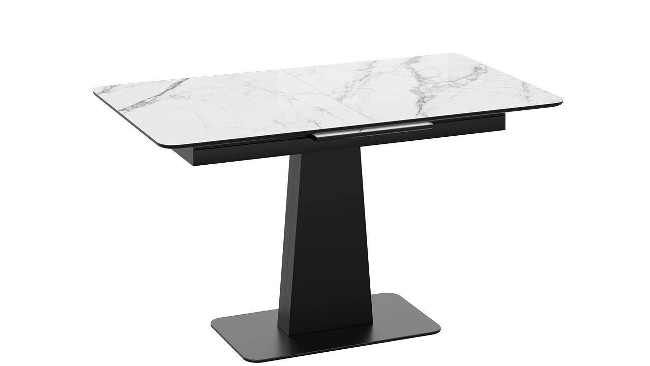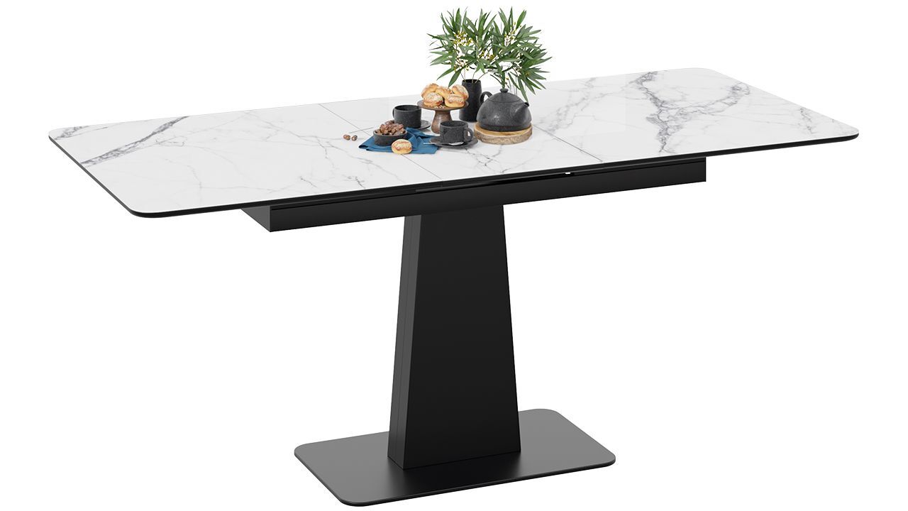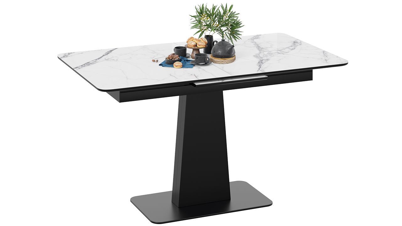 Современное цветовое оформление. Разнообразие актуальных цветовых исполнений позволяет приобрести модель исходя из индивидуальных предпочтений каждого потребителя, подобрав мебель на любой вкус и цвет. Новинка представлена в декорах с глянцевой белой и черной столешницей, с рисунком «под мрамор», которые воплощают роскошь современных модных тенденций, а столешница со стеклом «оникс» выражает благородство и безупречность. Вставка изготовлена со стеклом, на которой продолжается рисунок декора, что позволяет столу не терять эстетической окраски даже в разложенном варианте, делая образ изделия целостным и завершенным.