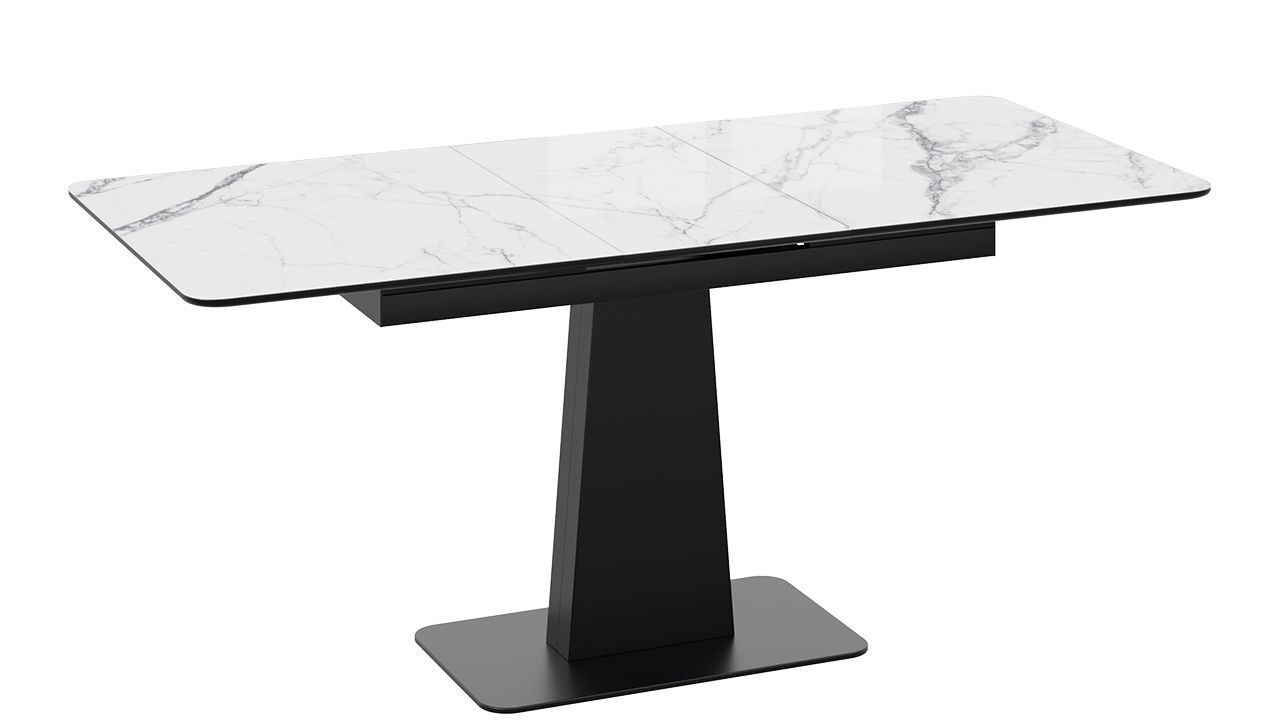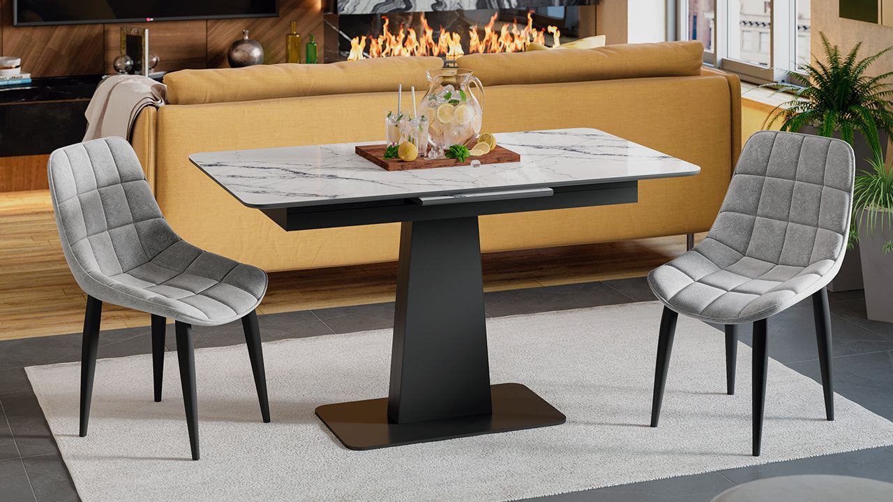 Современное цветовое оформление. Разнообразие актуальных цветовых исполнений позволяет приобрести модель исходя из индивидуальных предпочтений каждого потребителя, подобрав мебель на любой вкус и цвет. Новинка представлена в декорах с глянцевой белой и черной столешницей, с рисунком «под мрамор», которые воплощают роскошь современных модных тенденций, а столешница со стеклом «оникс» выражает благородство и безупречность. Вставка изготовлена со стеклом, на которой продолжается рисунок декора, что позволяет столу не терять эстетической окраски даже в разложенном варианте, делая образ изделия целостным и завершенным.