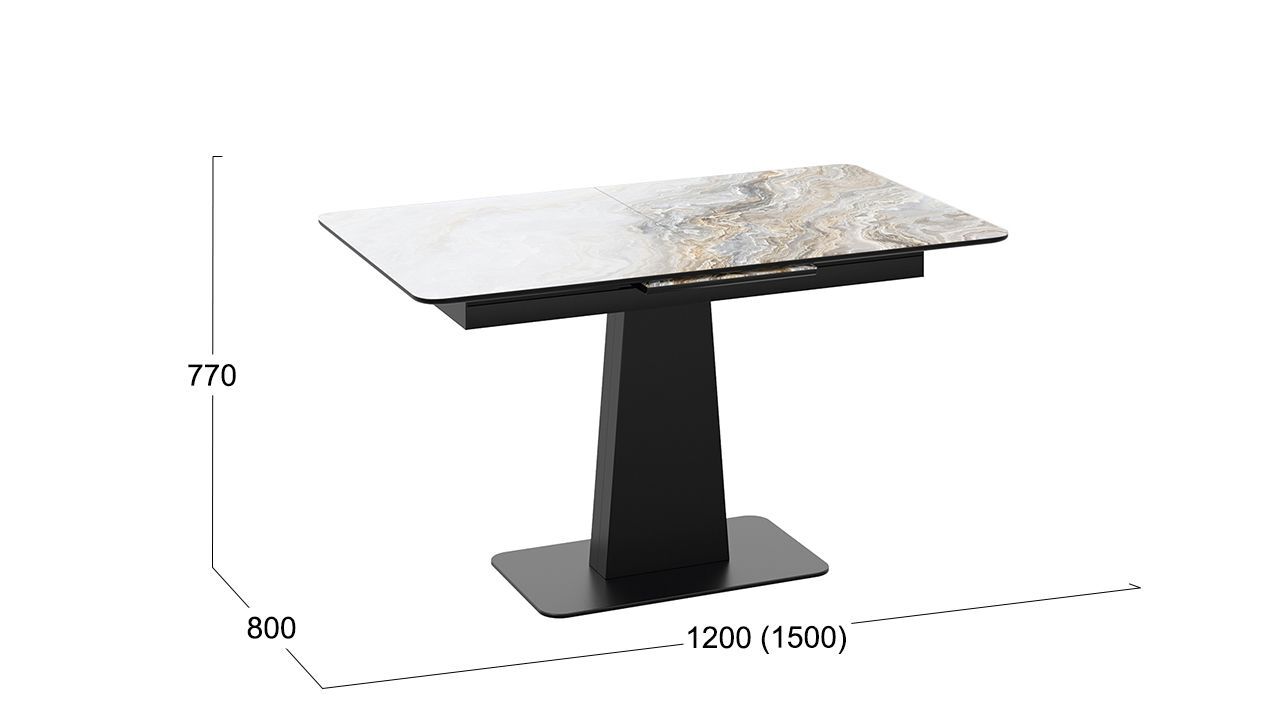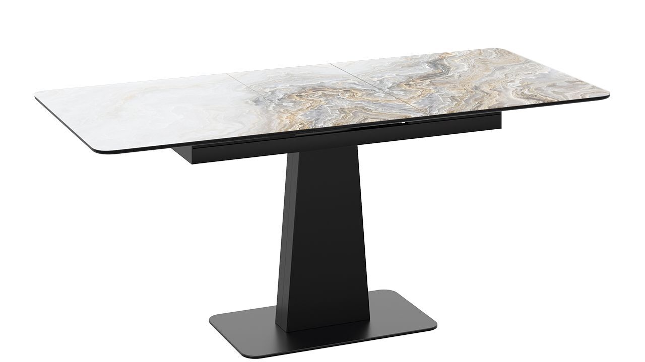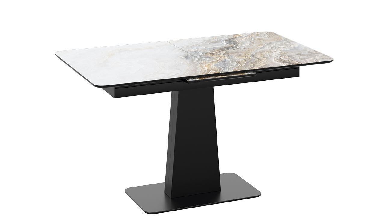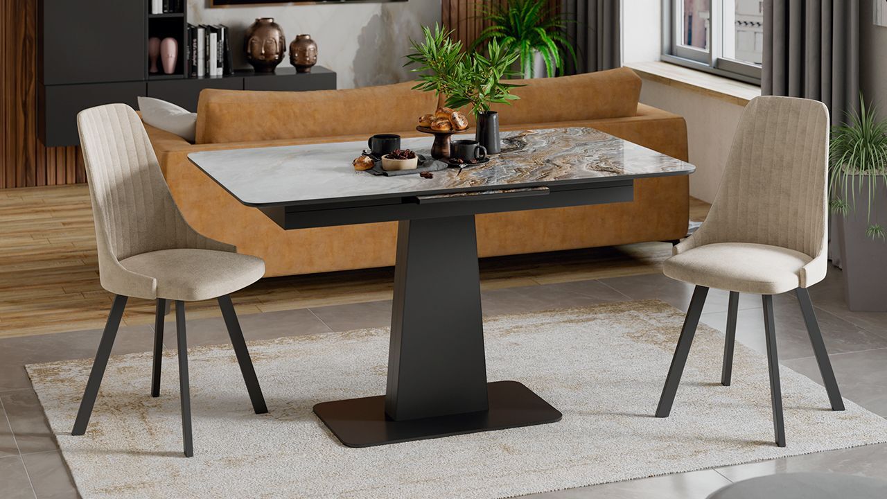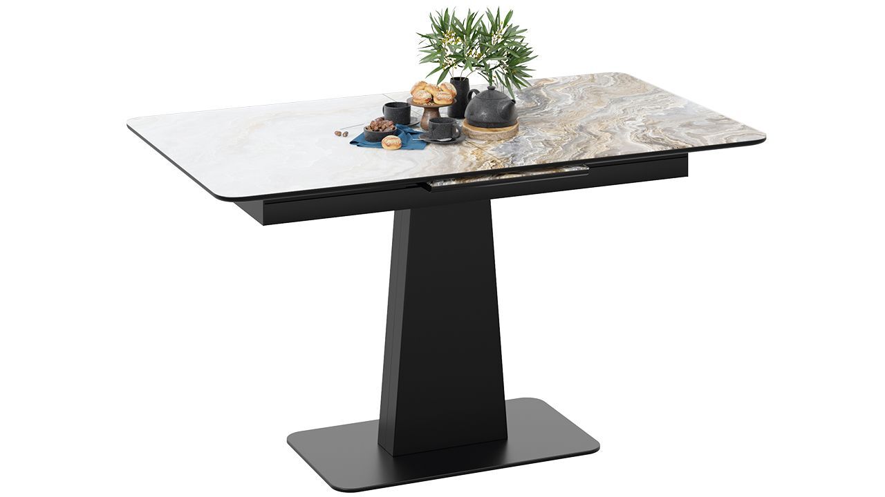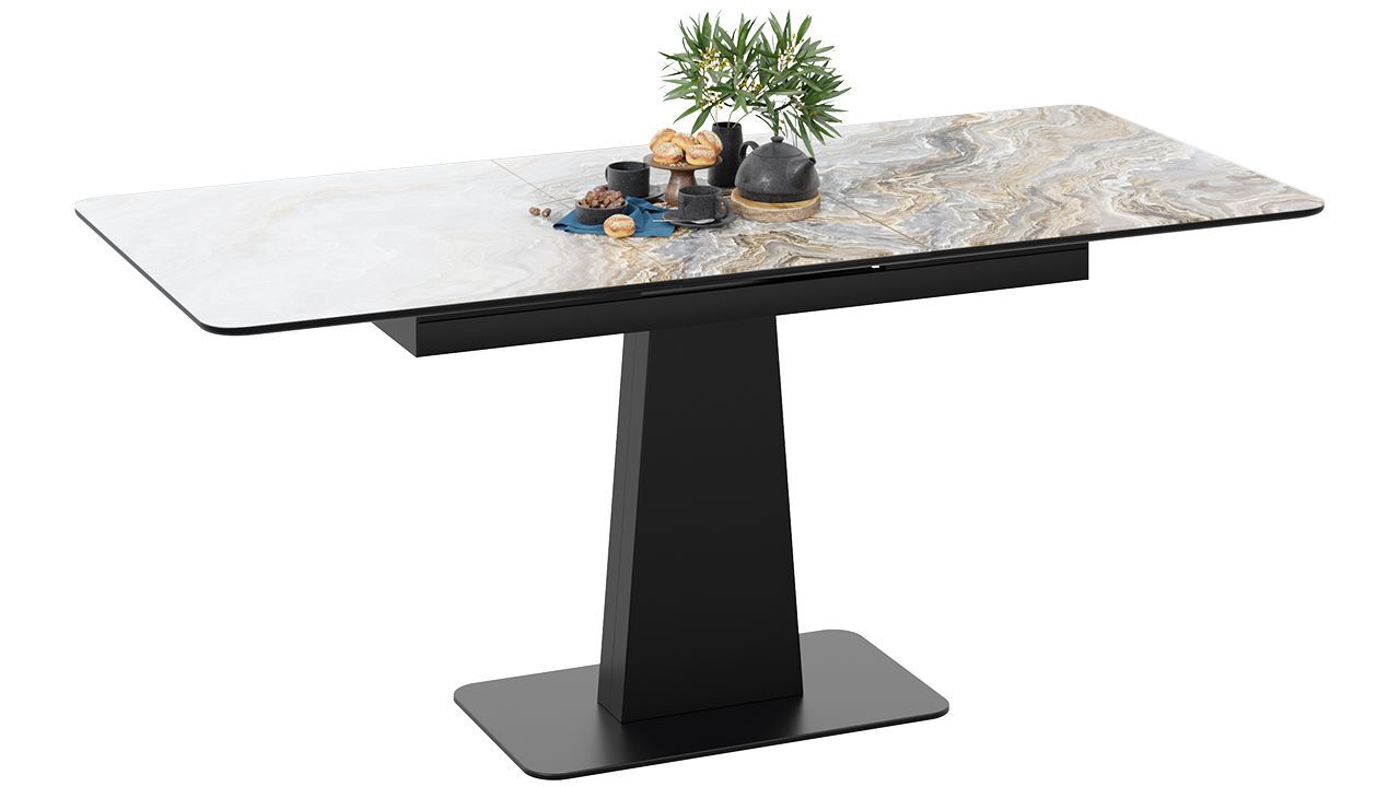 Современное цветовое оформление. Разнообразие актуальных цветовых исполнений позволяет приобрести модель исходя из индивидуальных предпочтений каждого потребителя, подобрав мебель на любой вкус и цвет. Новинка представлена в декорах с глянцевой белой и черной столешницей, с рисунком «под мрамор», которые воплощают роскошь современных модных тенденций, а столешница со стеклом «оникс» выражает благородство и безупречность. Вставка изготовлена со стеклом, на которой продолжается рисунок декора, что позволяет столу не терять эстетической окраски даже в разложенном варианте, делая образ изделия целостным и завершенным.