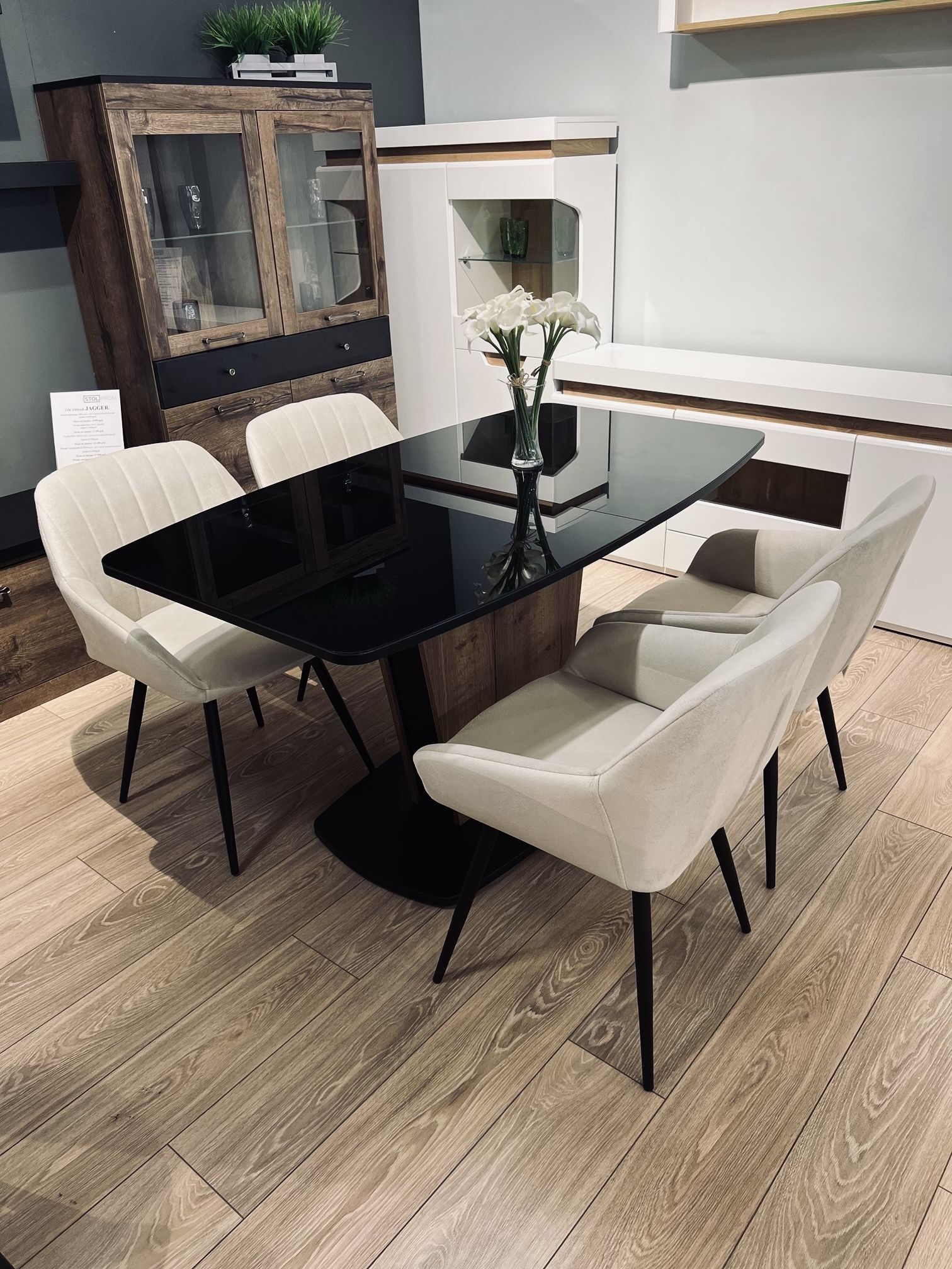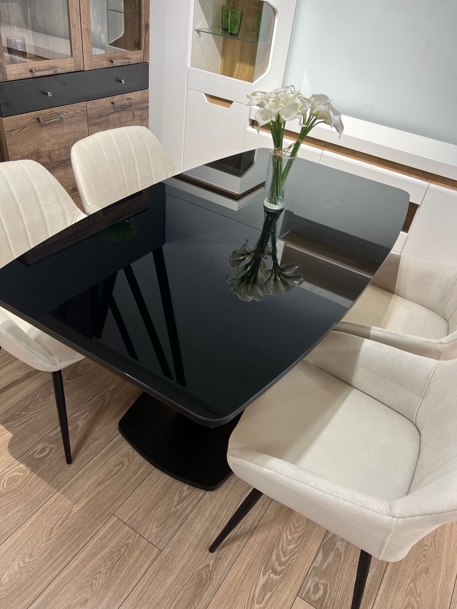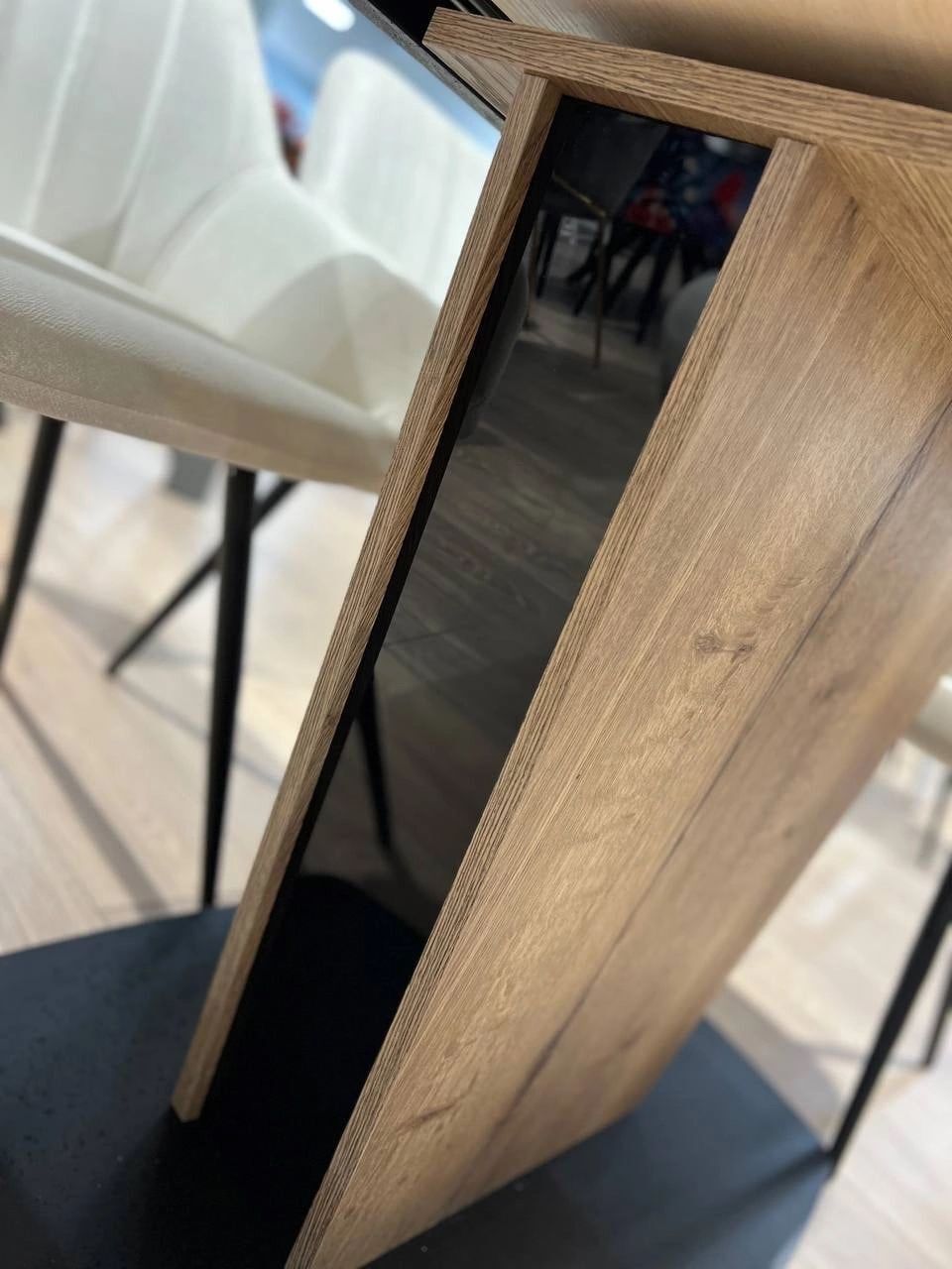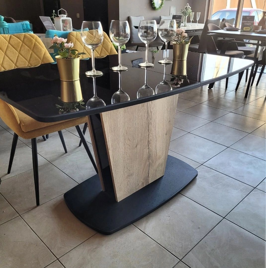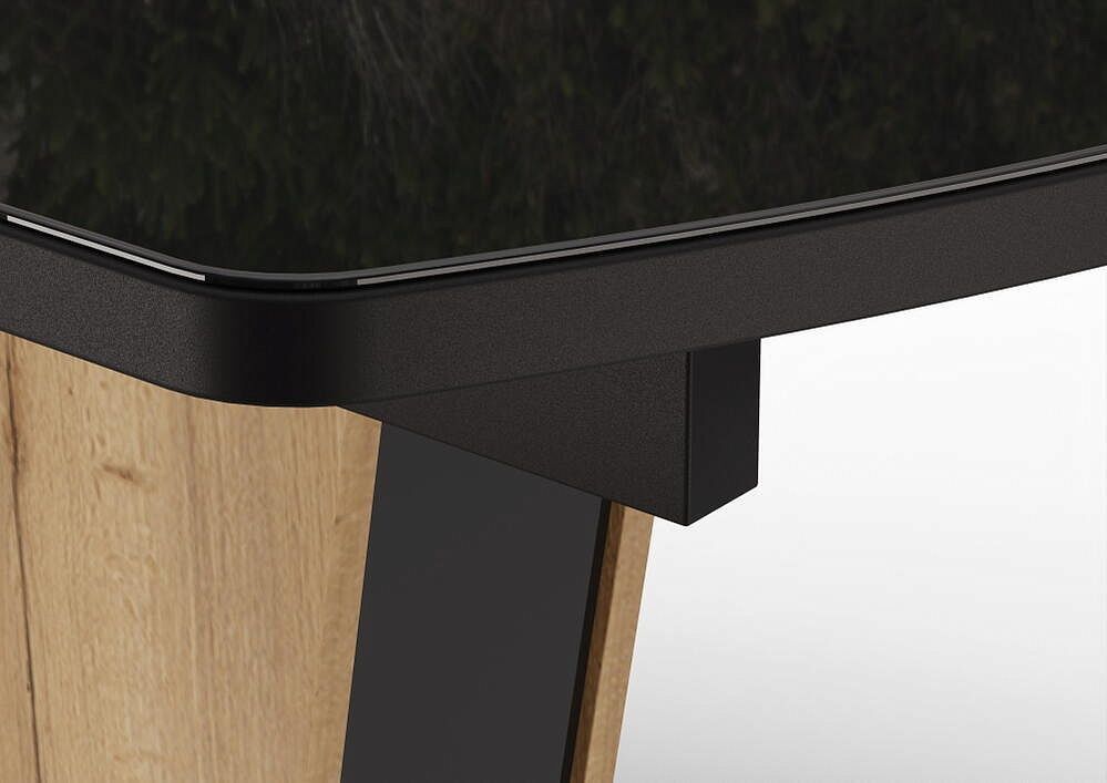 Столешница и вставка изготовлены из ЛДСП 22 мм в черном закаленном стекле.