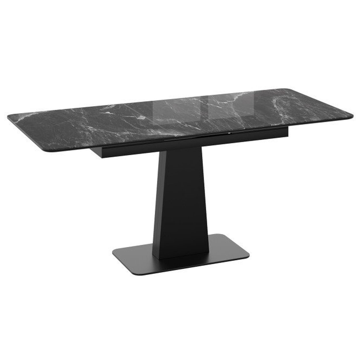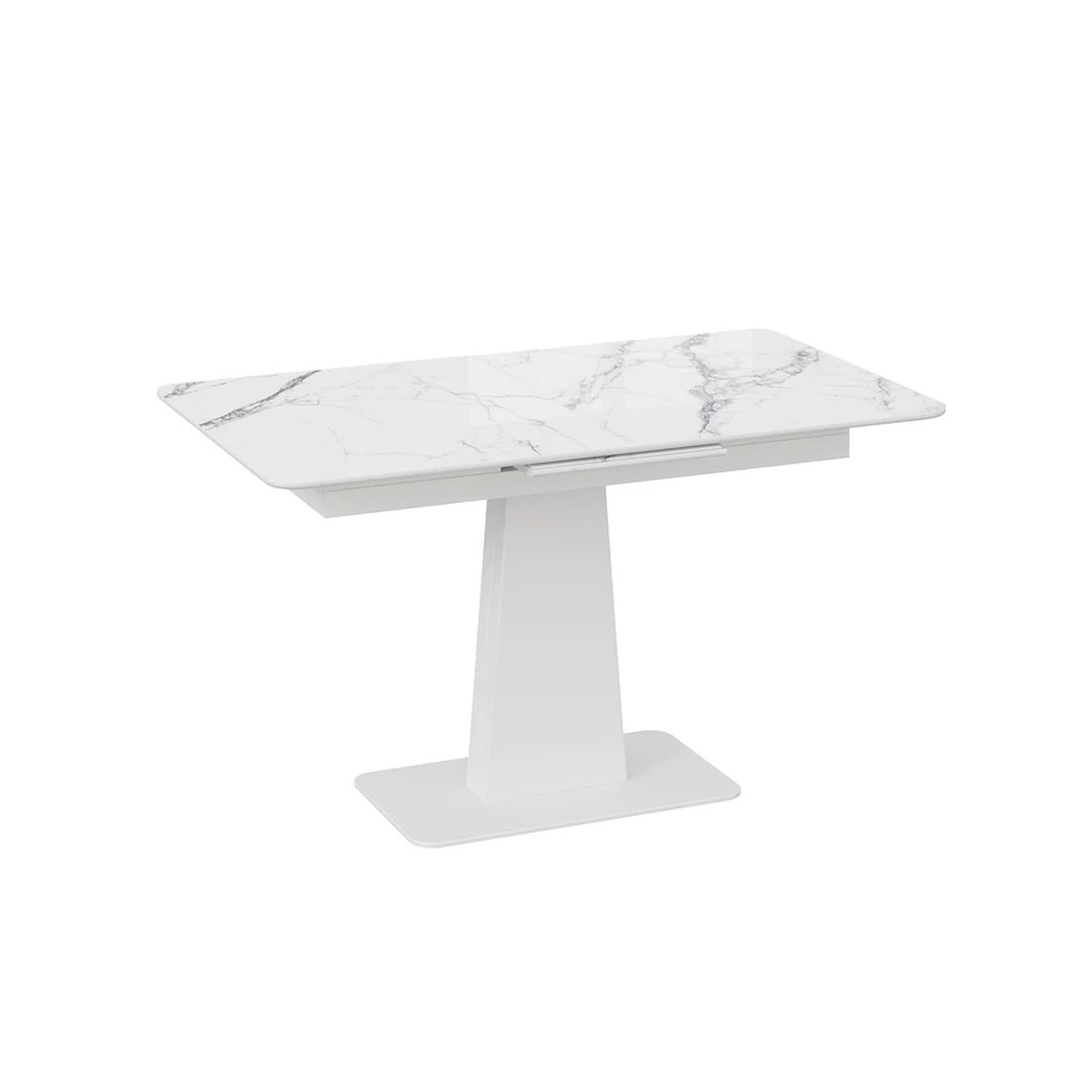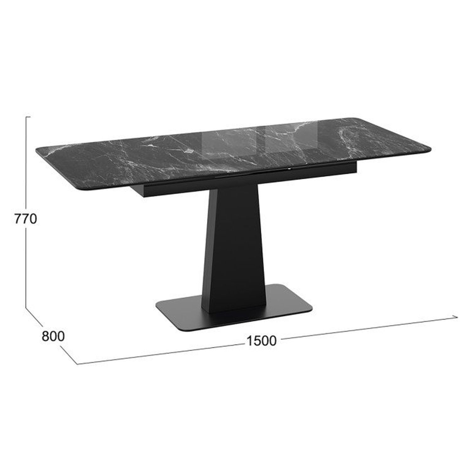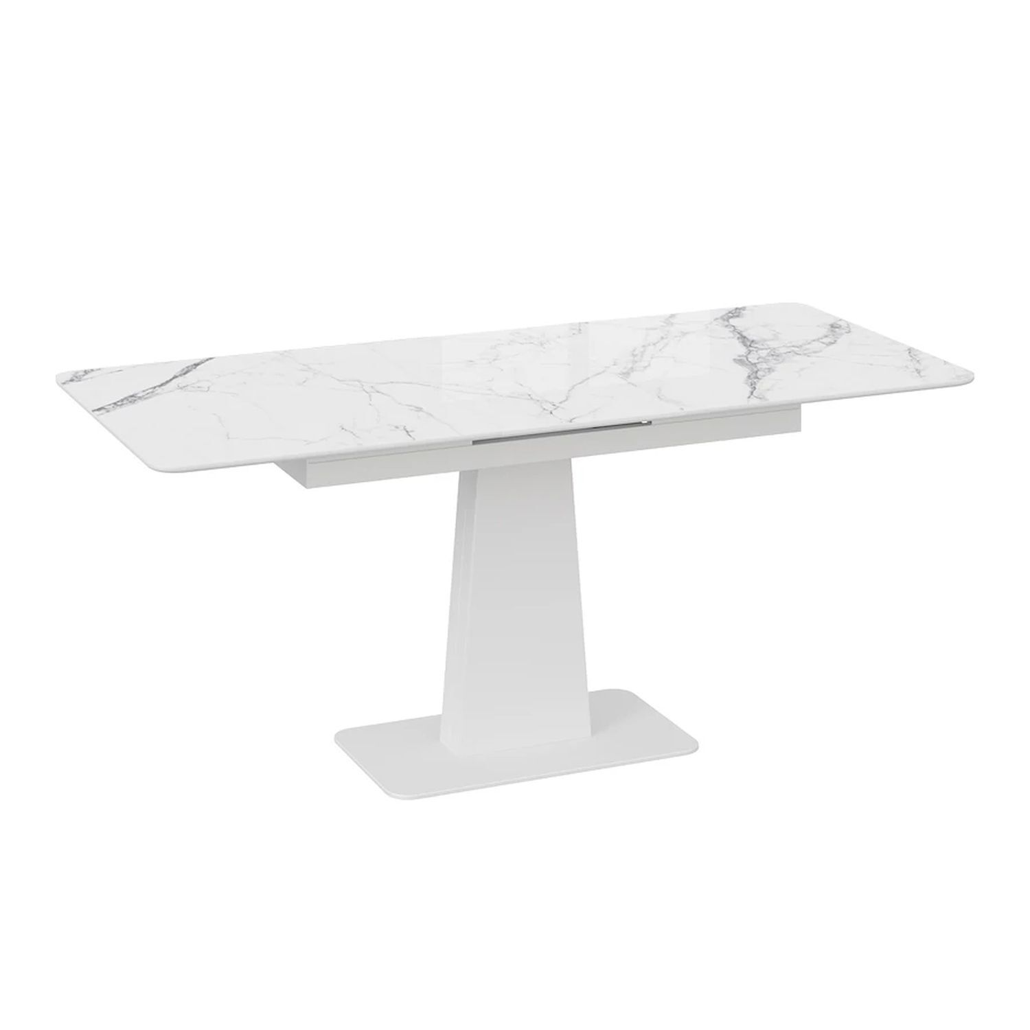 Современное цветовое оформление. Разнообразие актуальных цветовых исполнений позволяет приобрести модель исходя из индивидуальных предпочтений каждого потребителя, подобрав мебель на любой вкус и цвет. Новинка представлена в декорах с глянцевой белой и черной столешницей, с рисунком «под мрамор», которые воплощают роскошь современных модных тенденций, а столешница со стеклом «оникс» выражает благородство и безупречность. Вставка изготовлена со стеклом, на которой продолжается рисунок декора, что позволяет столу не терять эстетической окраски даже в разложенном варианте, делая образ изделия целостным и завершенным.
