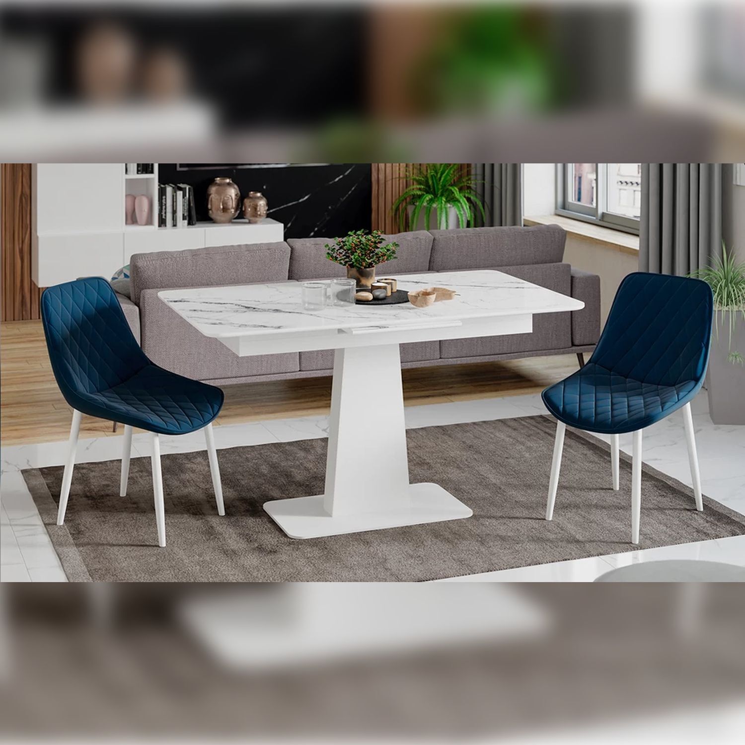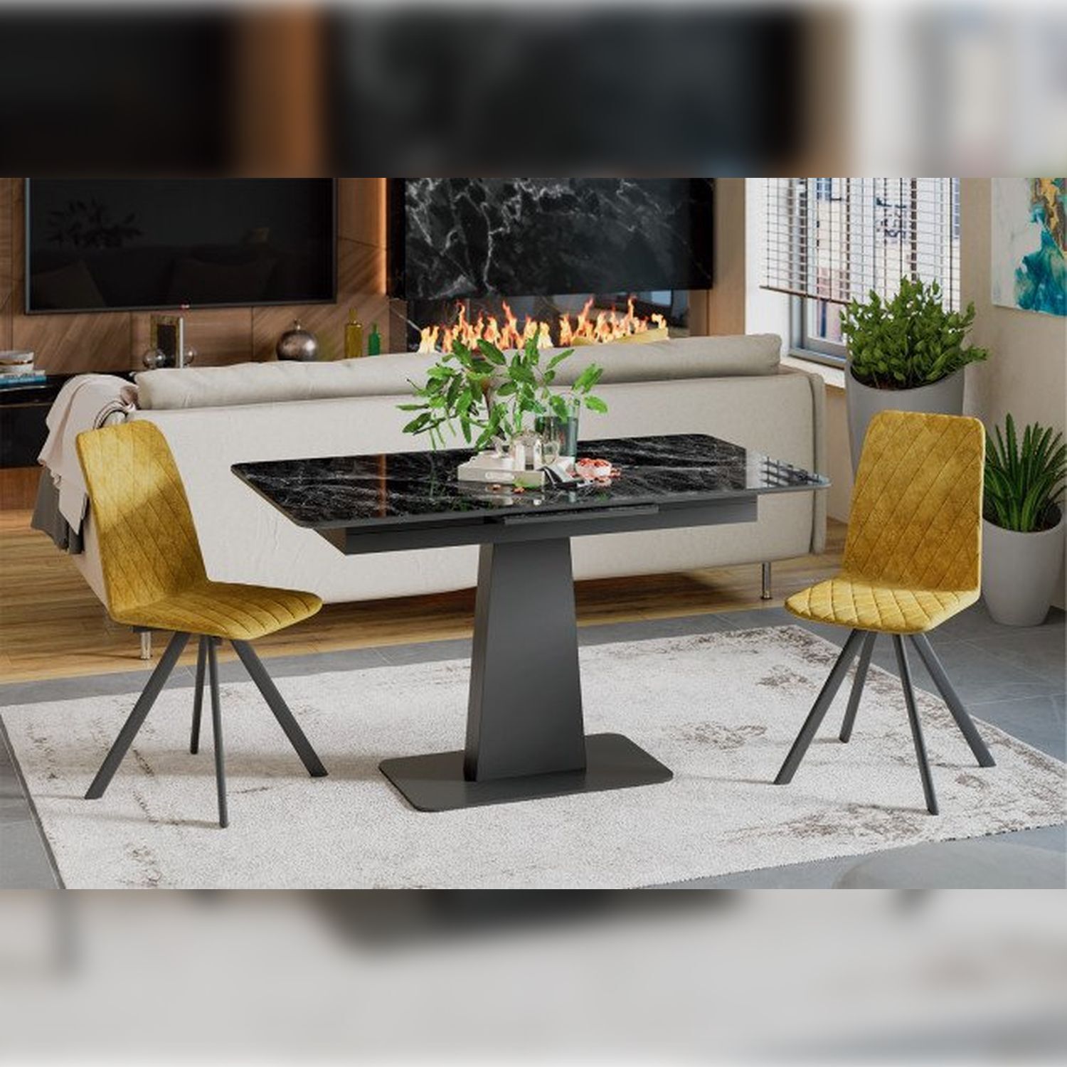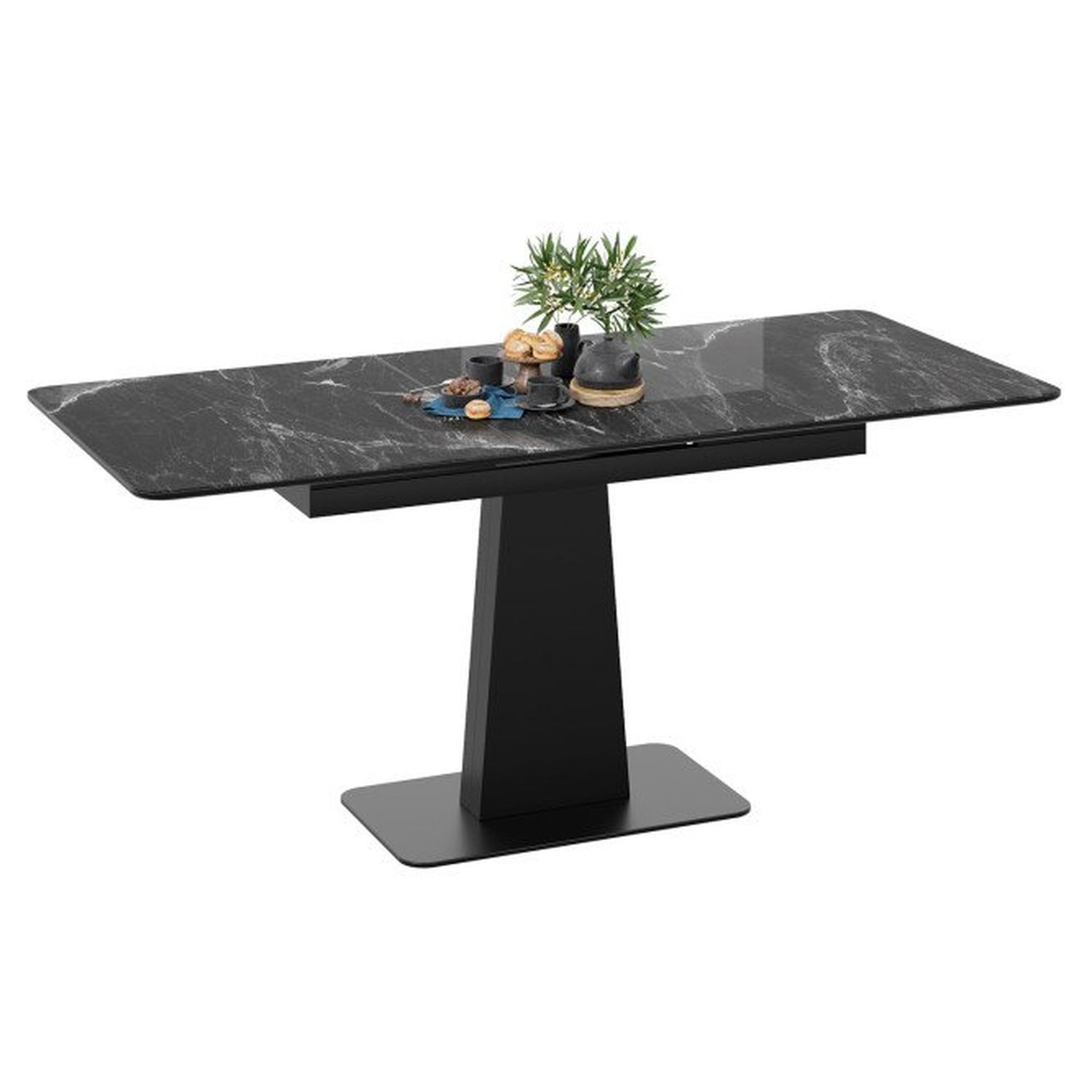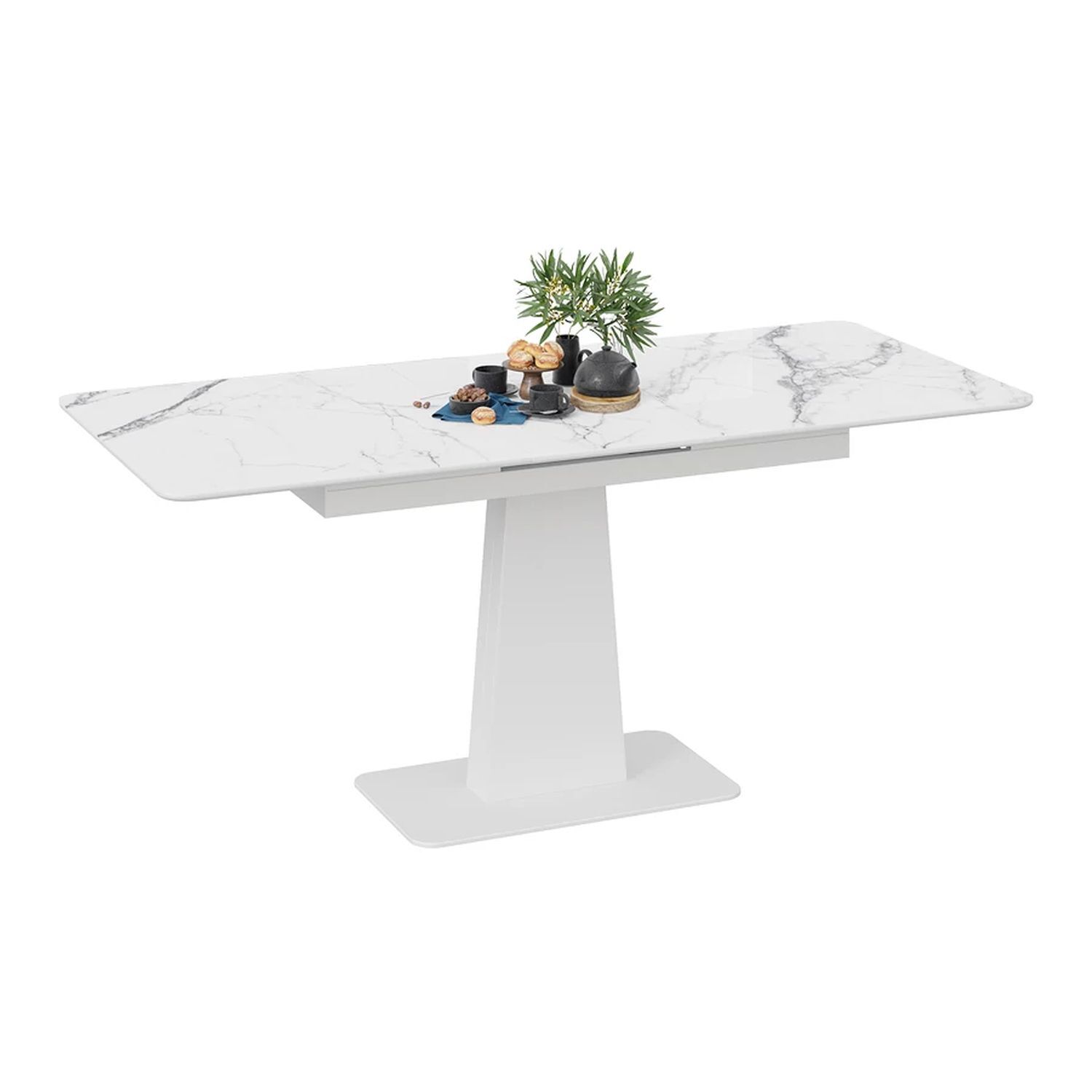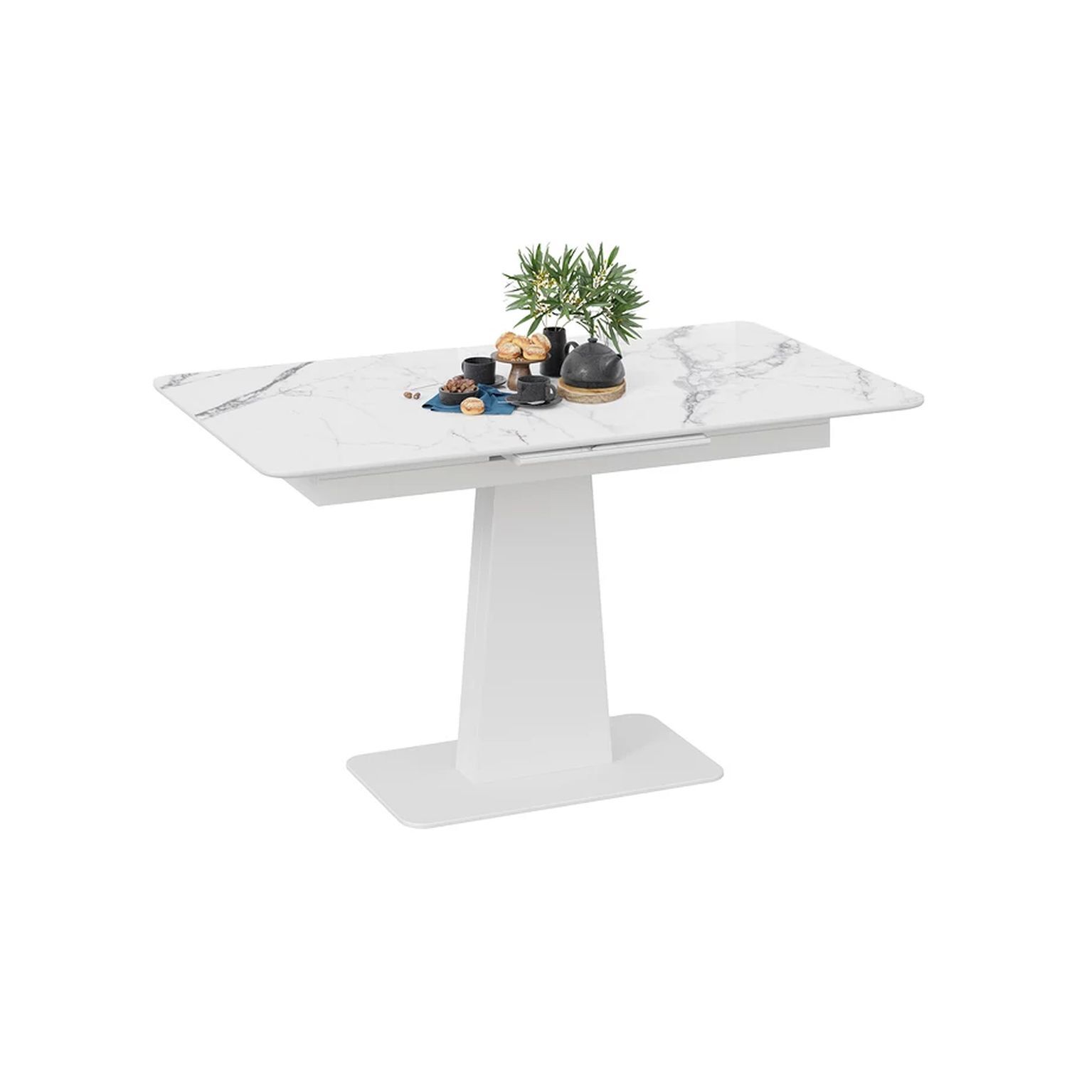 Современное цветовое оформление. Разнообразие актуальных цветовых исполнений позволяет приобрести модель исходя из индивидуальных предпочтений каждого потребителя, подобрав мебель на любой вкус и цвет. Новинка представлена в декорах с глянцевой белой и черной столешницей, с рисунком «под мрамор», которые воплощают роскошь современных модных тенденций, а столешница со стеклом «оникс» выражает благородство и безупречность. Вставка изготовлена со стеклом, на которой продолжается рисунок декора, что позволяет столу не терять эстетической окраски даже в разложенном варианте, делая образ изделия целостным и завершенным.