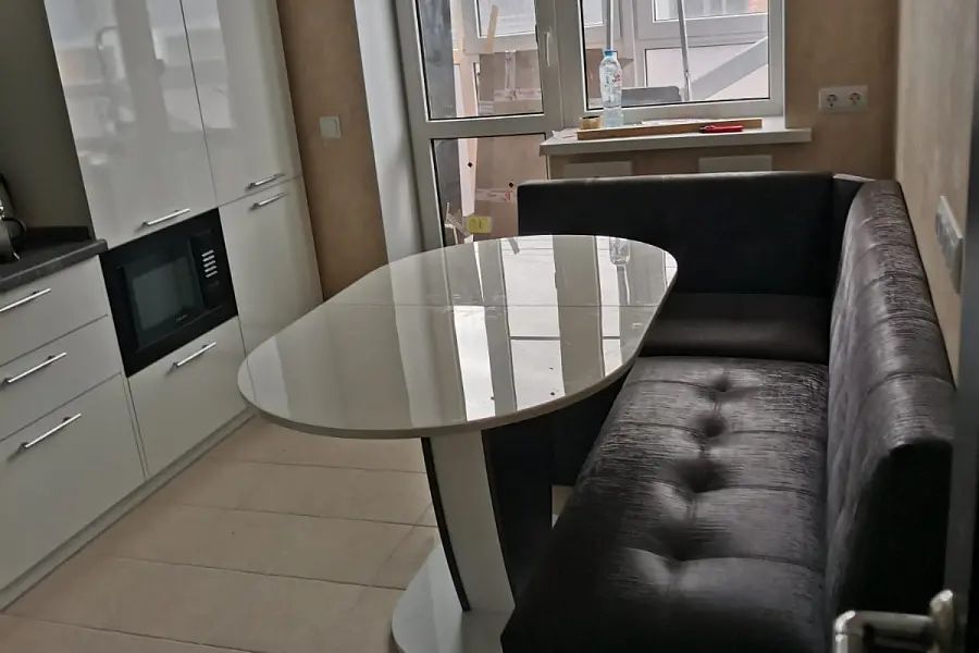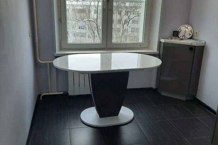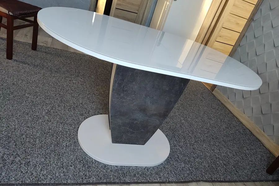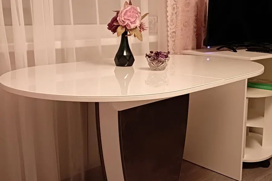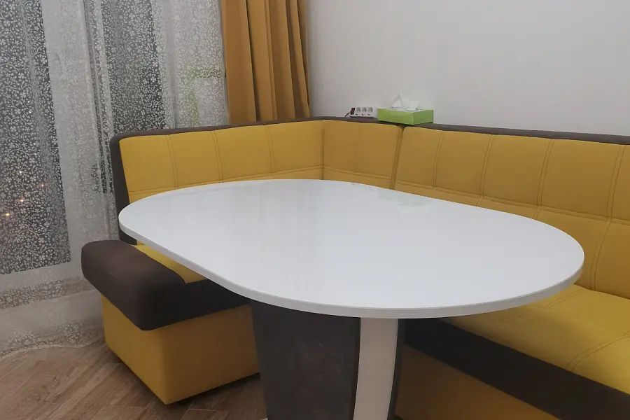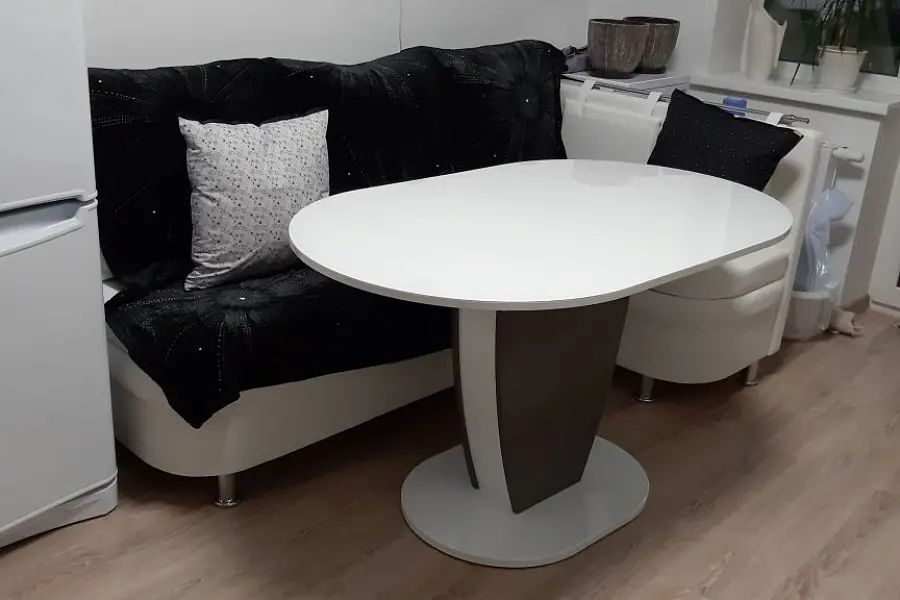 Материалы. Столешница изготовлена из ЛДСП 16 мм и осветленного закаленного глянцевого стекла 4 мм, вставка выполнена из ЛДСП 22 мм. Модель имеет оригинальную скругленную форму опоры с белыми глянцевыми элементами из МДФ 4 мм по бокам. Плавные линии и креативное решение со вставками добавят кухне ноток оригинальности и эксцентричности. Основание изготовлено из МДФ 22 мм.