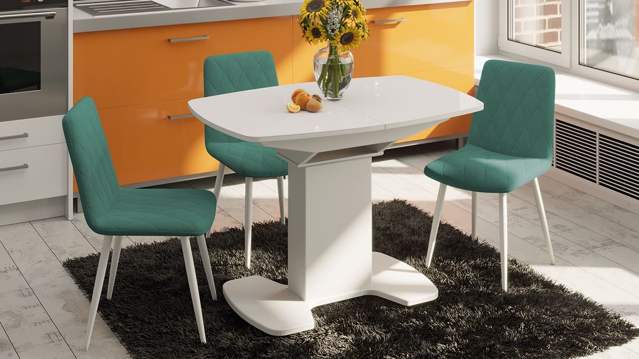 Стол выполнен из прочного и надежного МДФ, покрытого белым глянцевым стеклом, что придает ему элегантный и современный вид. Столешница из стекла добавляет легкости и изящества, а также обеспечивает прочность и долговечность изделия.