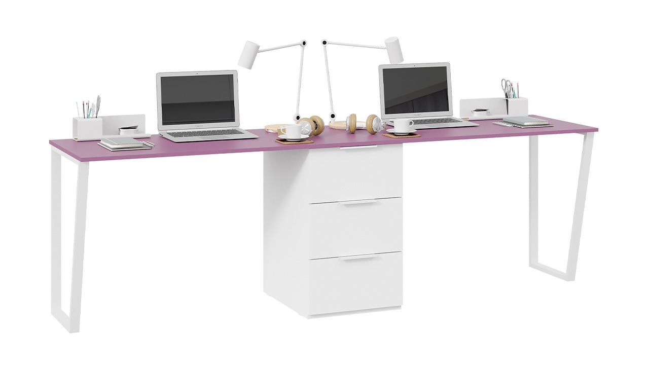 Современный и стильный дизайн письменного стола с ящиками в белом и фиолетовом цвете подойдет для любого интерьера. Скандинавский стиль и прямые линии подчеркивают минимализм и современность.