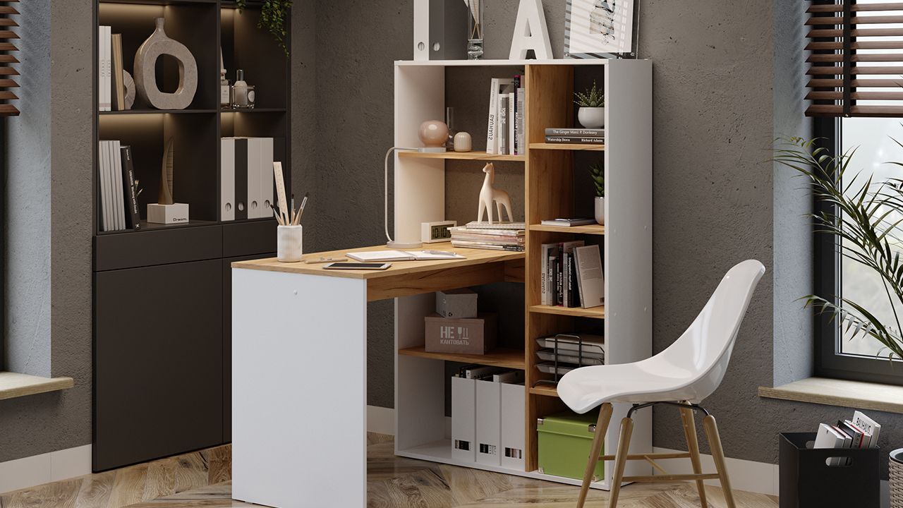 Стол письменный тип 16 совмещает в себе удобный письменный стол и стеллаж, что позволяет разделить зону комнаты на две части. В одной части можно разместить все необходимые элементы для работы и учебы, а в другой - диван или другой предмет мебели.
