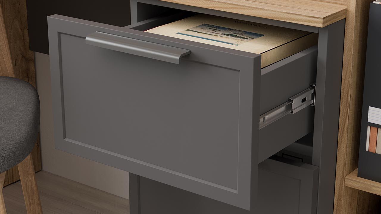 Стол оборудован тремя ящиками, что позволяет удобно хранить все необходимые письменные принадлежности. Тип направляющих - шариковые, что обеспечивает плавное и бесшумное выдвижение ящиков.
