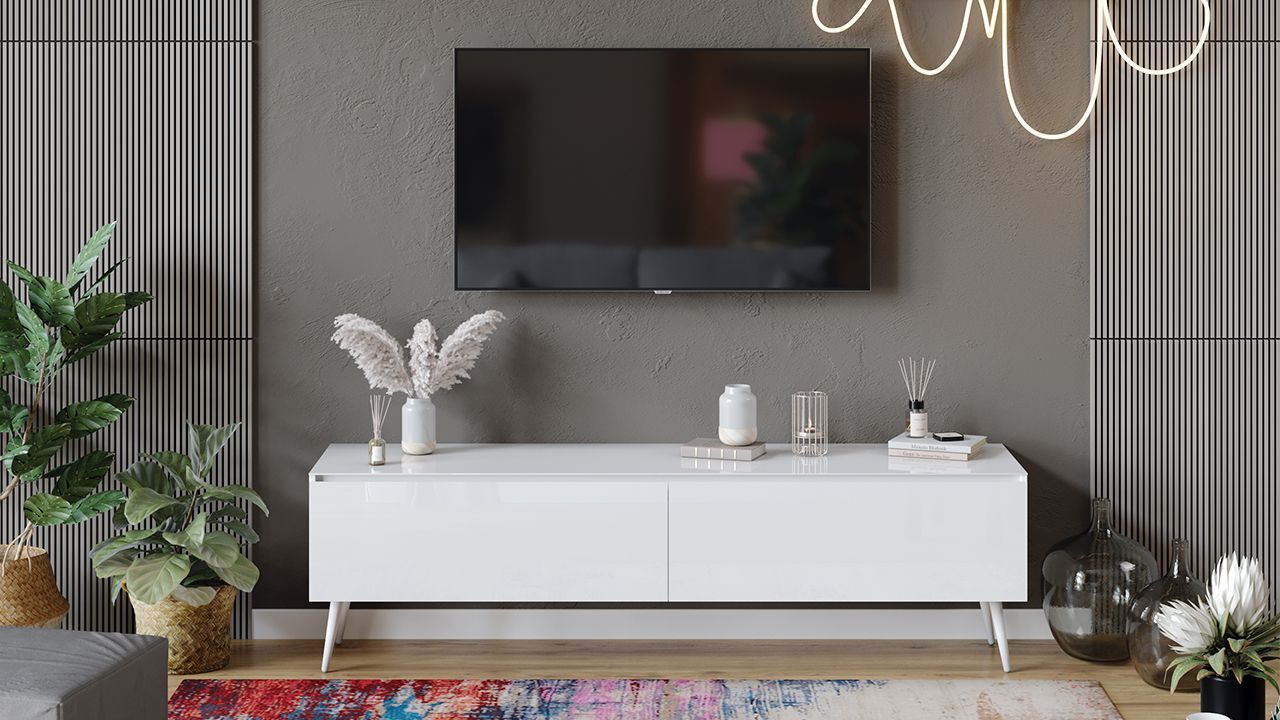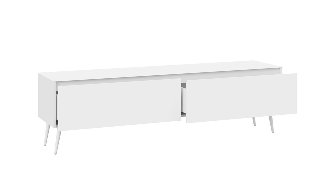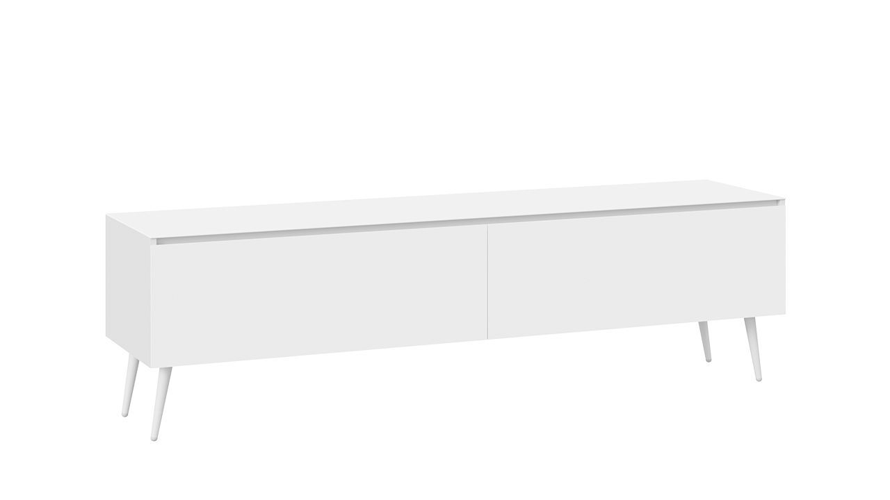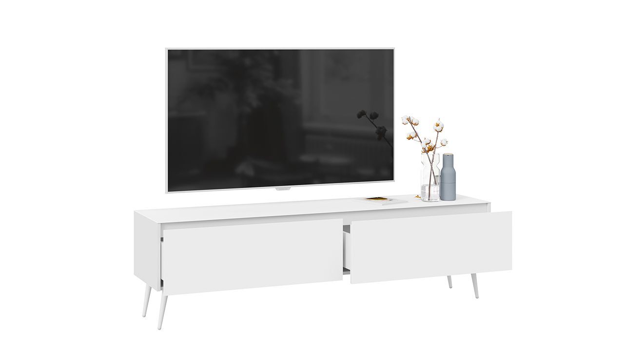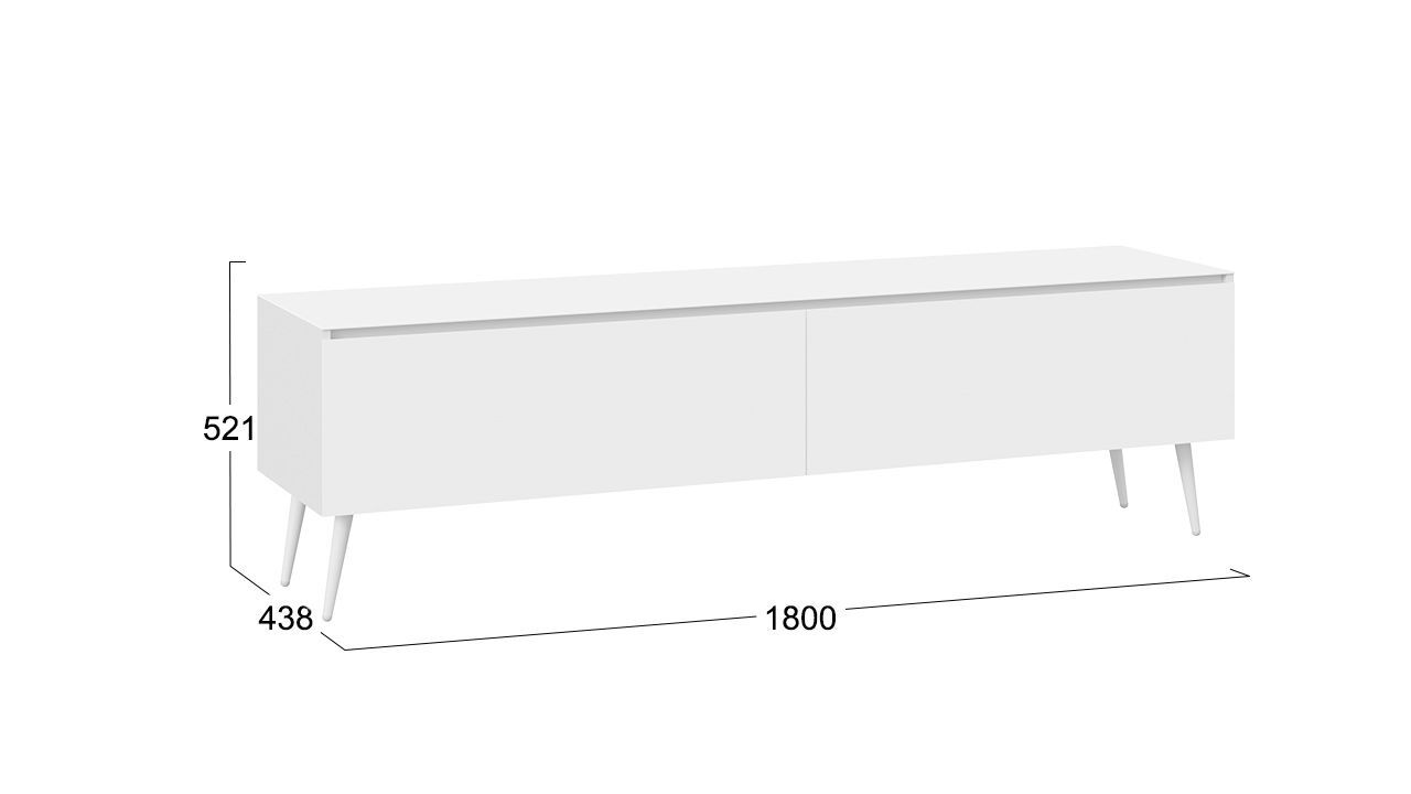 Тумба под телевизор напольная в белом глянцевом цвете с двумя ящиками и стеклянным фасадом. Габариты составляют 180х44х52 см, что позволяет разместить телевизор и другие необходимые предметы.