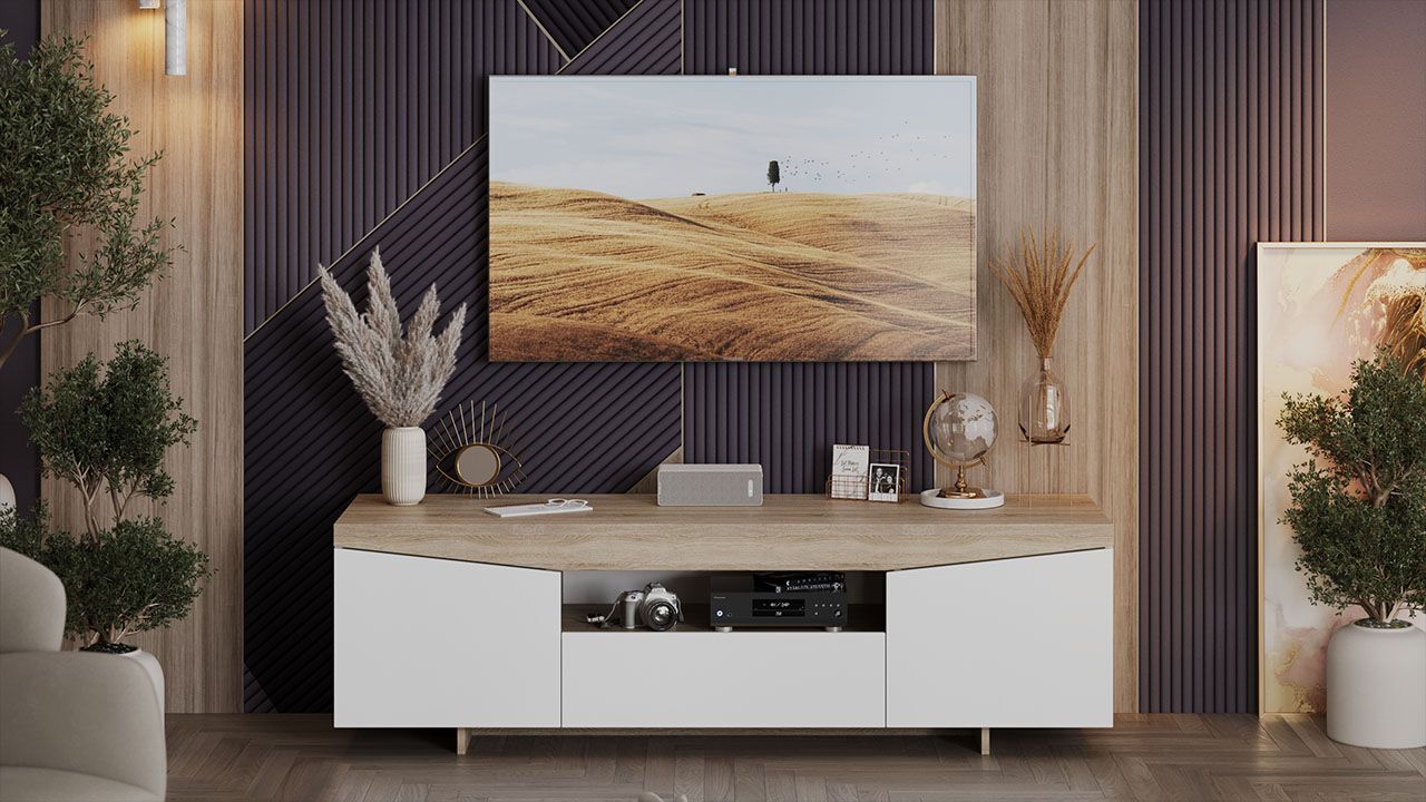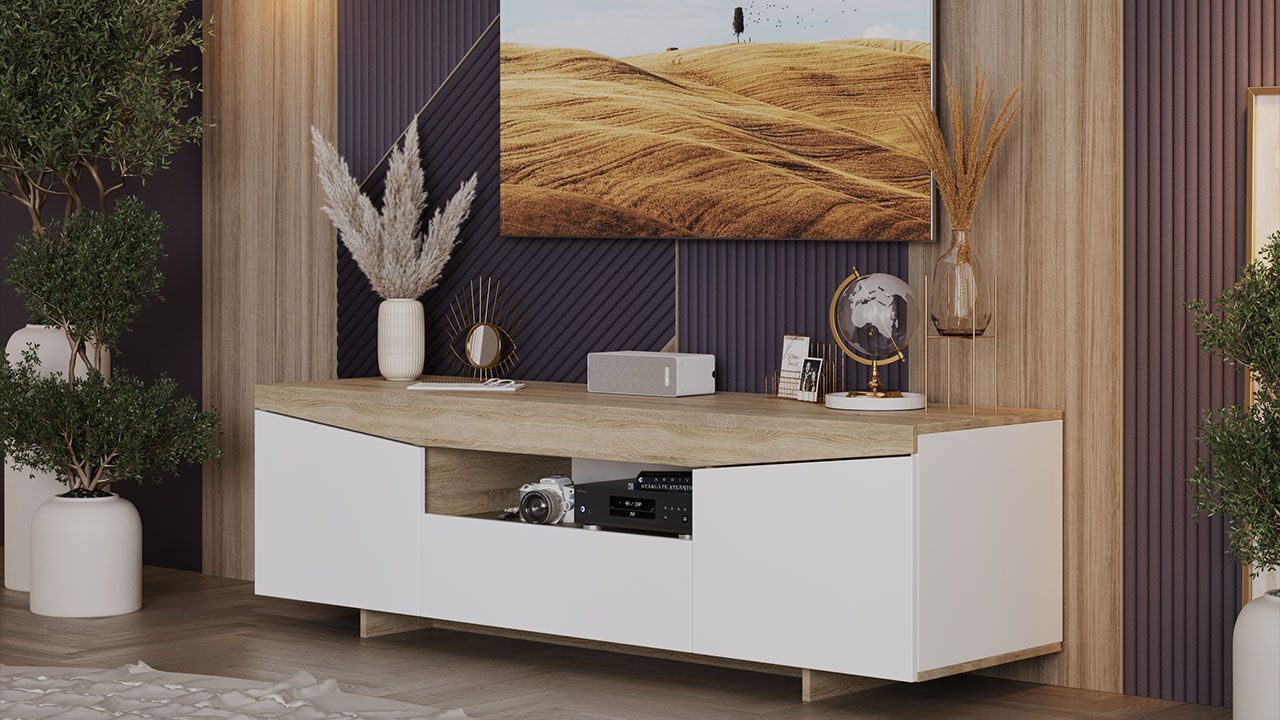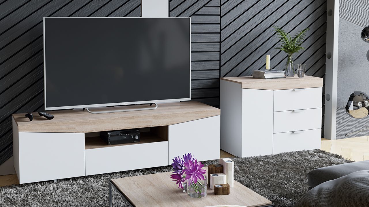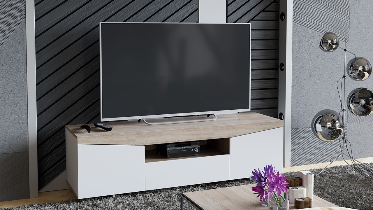 Тумба под телевизор напольная Белый Ясень/Дуб Сонома 160х45х48 см станет отличным дополнением к вашему интерьеру и обеспечит комфортное размещение телевизора и других предметов.