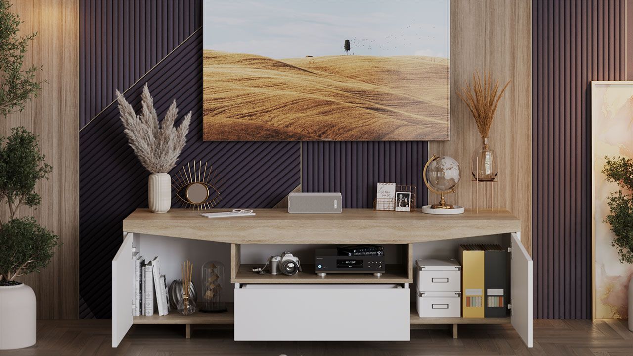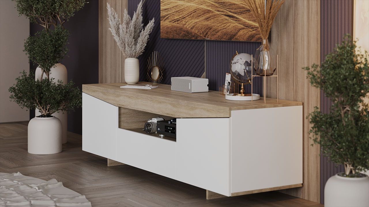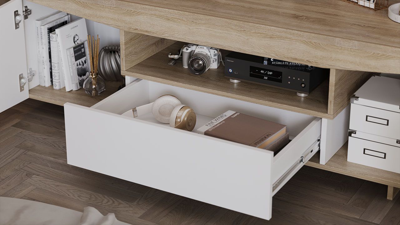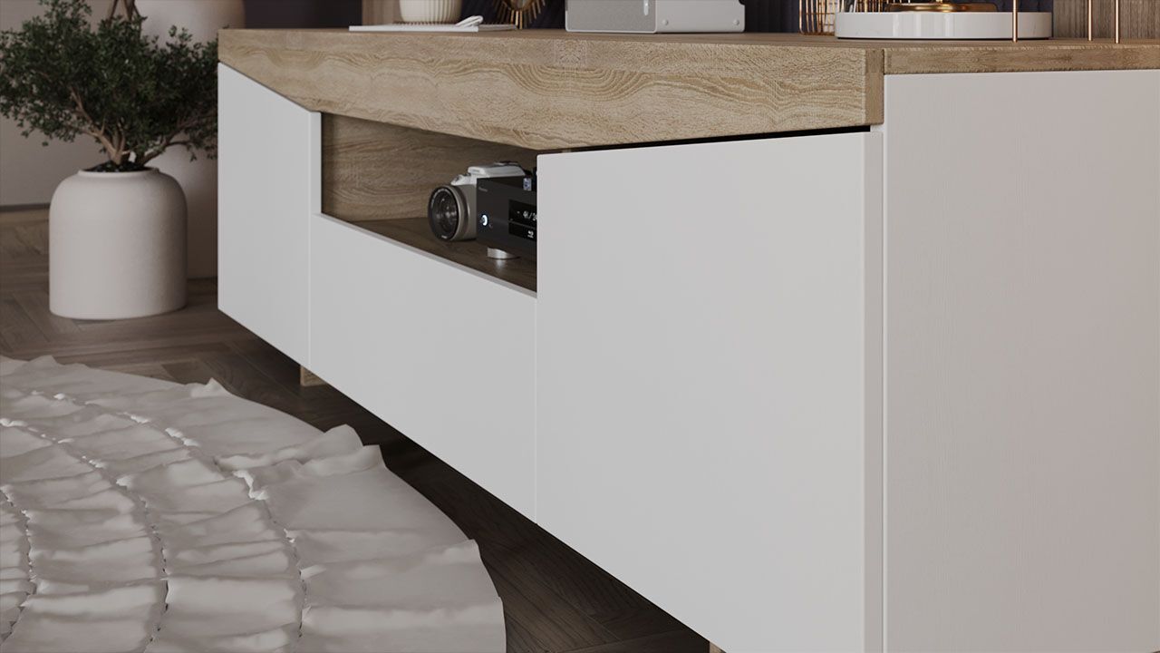 Продуманная конструкция и вместительность: тумба имеет габаритные размеры 160х45х48 см, что позволяет разместить телевизор и другие необходимые предметы. В конструкции тумбы предусмотрены один выдвижной ящик и три полки, на которых можно разместить аксессуары и предметы декора.