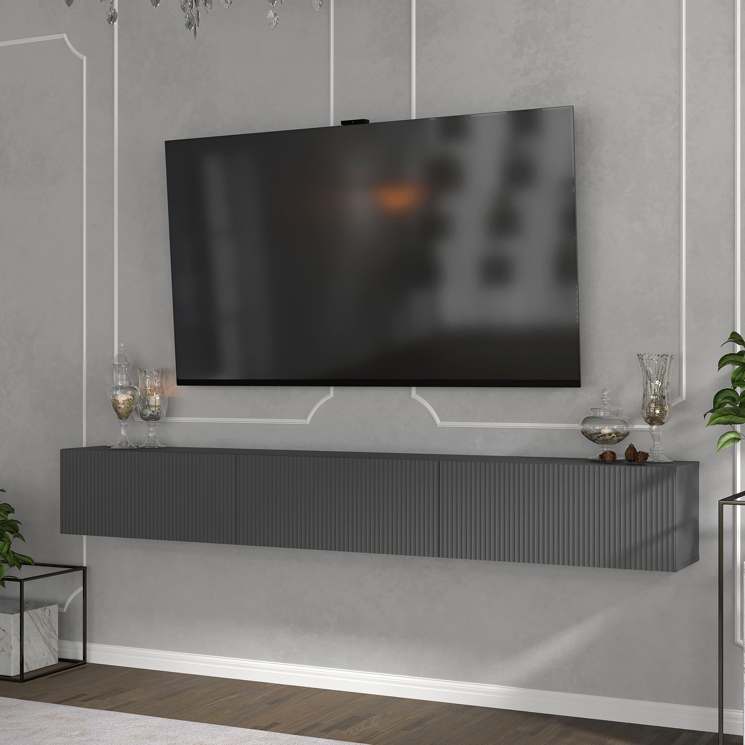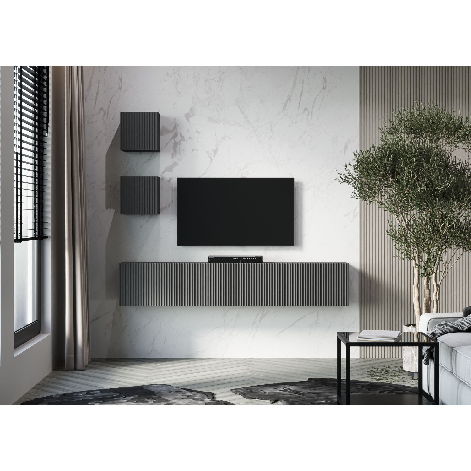 Тумба выполнена в современном стиле, сочетающем в себе серый цвет. Рифленый фасад добавляет изысканности и оригинальности этой мебели. Стенка с полками обеспечит вам удобное хранение различных предметов.